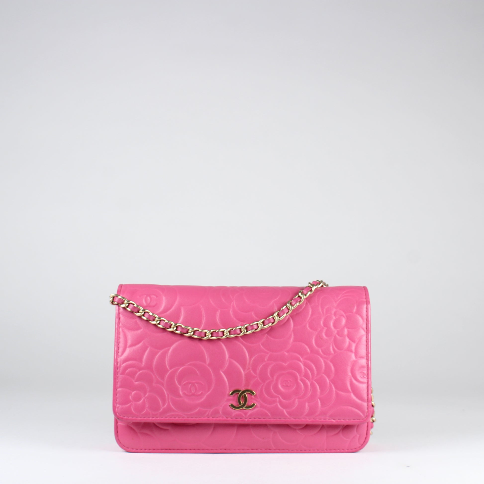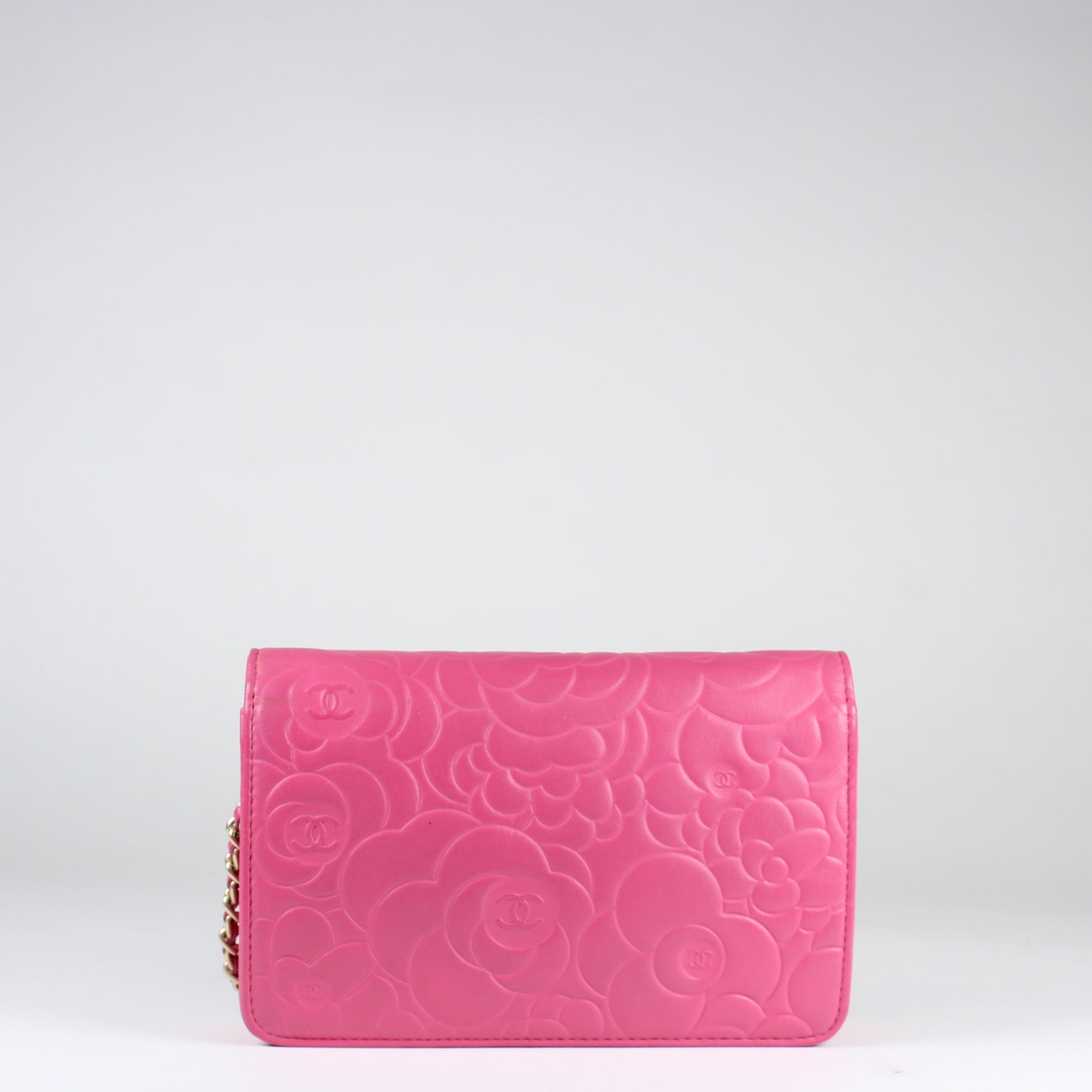 Noteworthy Features: Camellia-embossed design with CC logo on flap, multiple card slots, zip compartment, and chain strap interwoven with leather