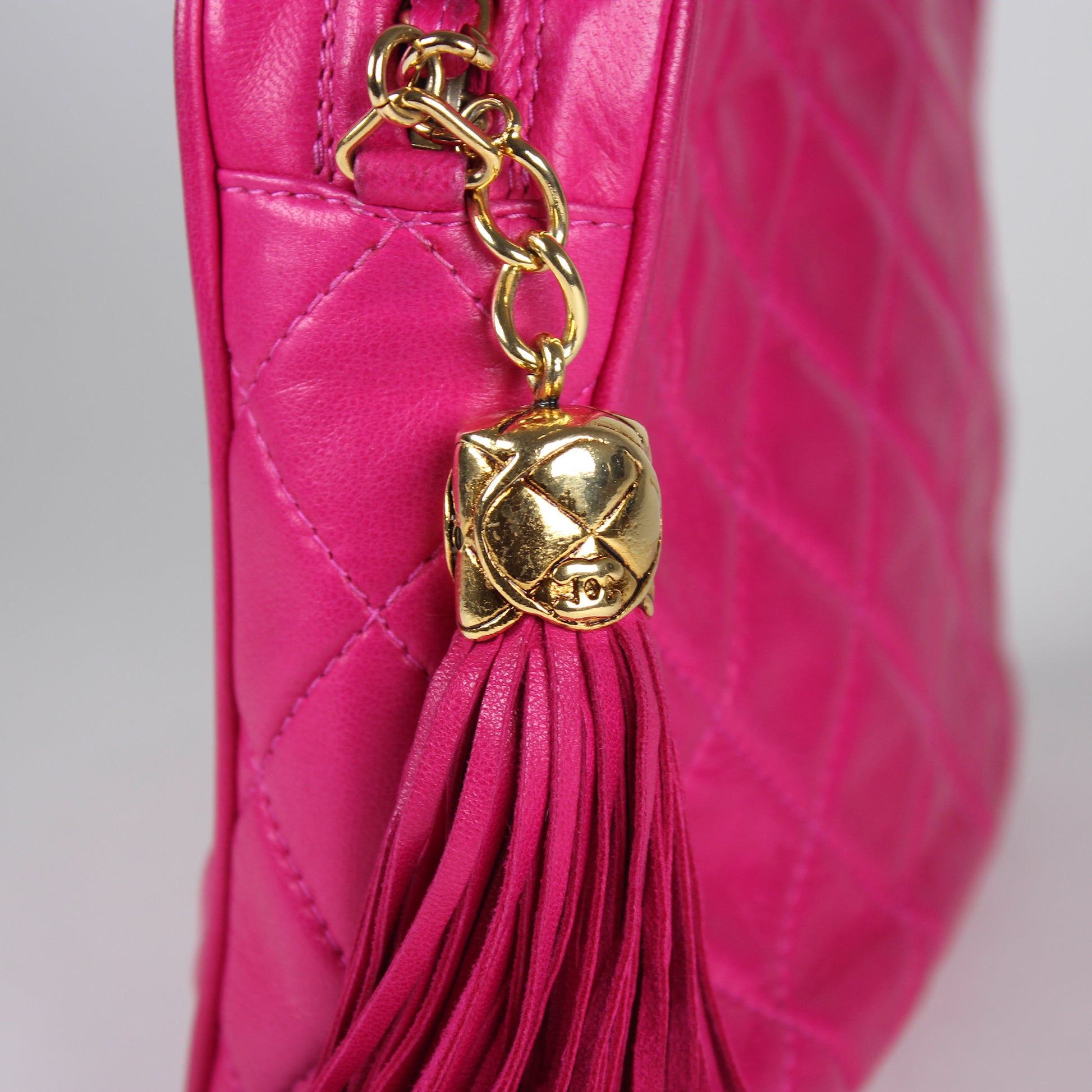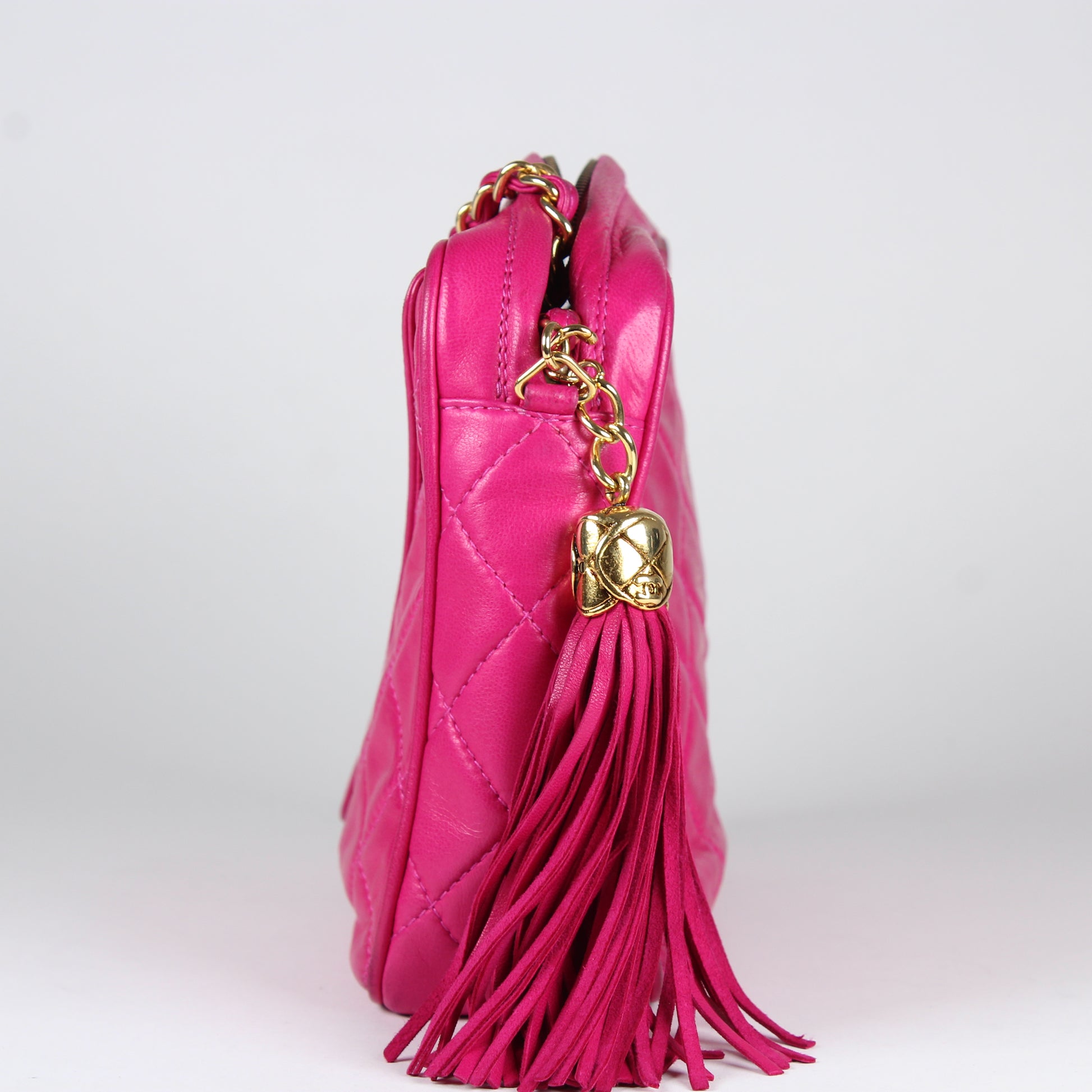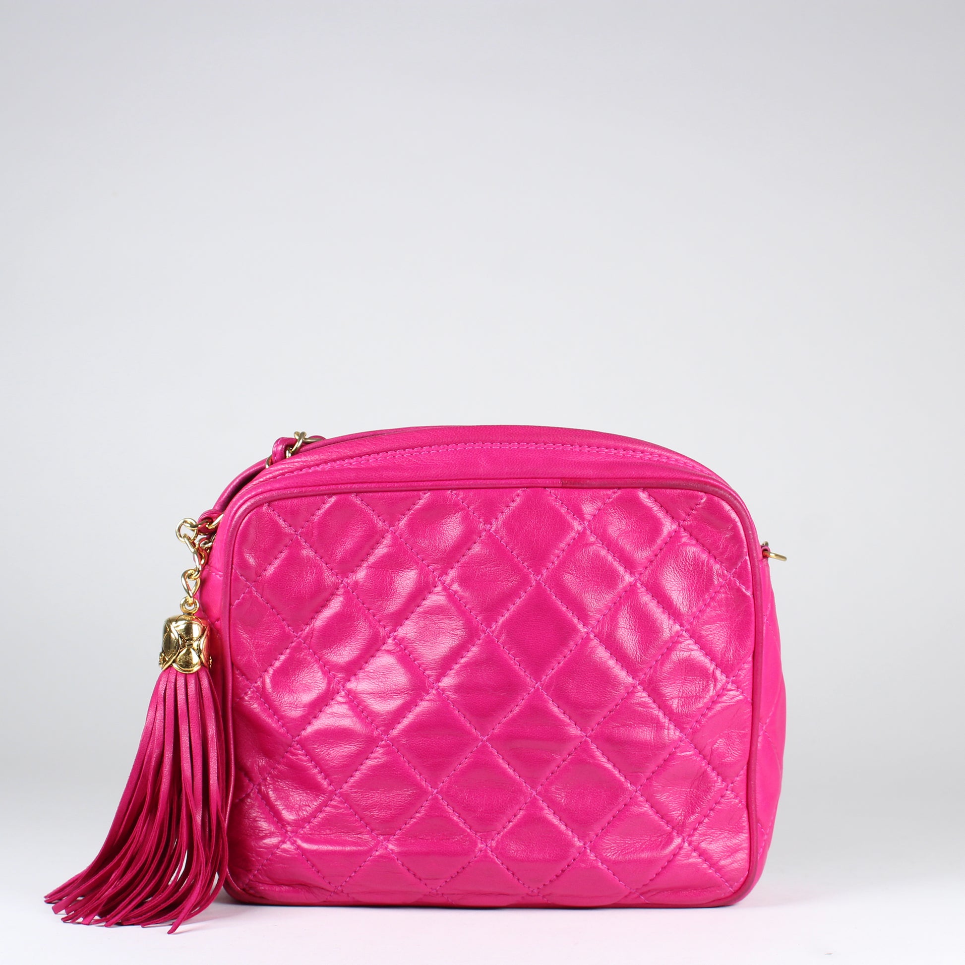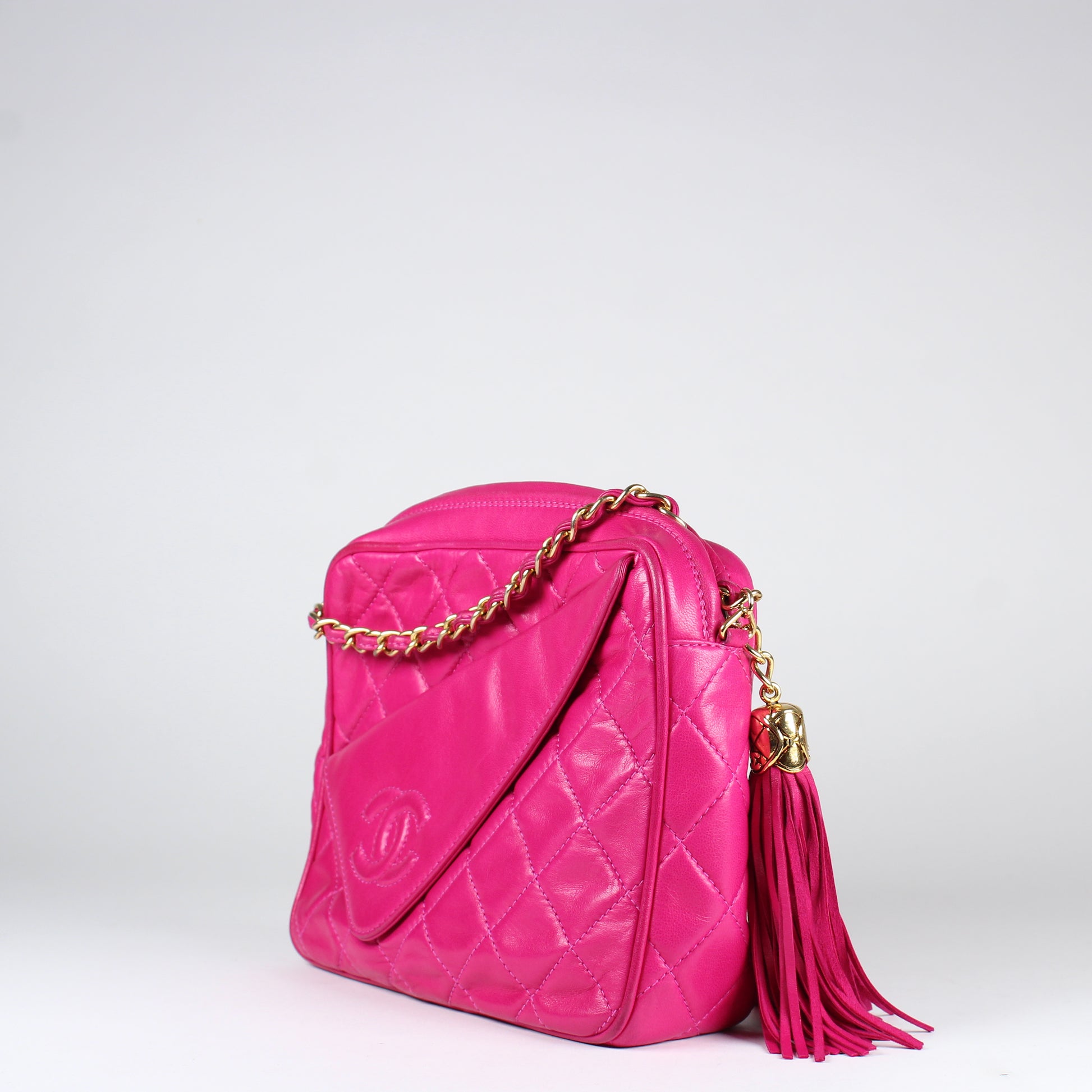 Noteworthy Features: Vintage camera bag silhouette with front envelope pocket featuring embossed CC, leather-interwoven chain strap, and tassel zipper pull