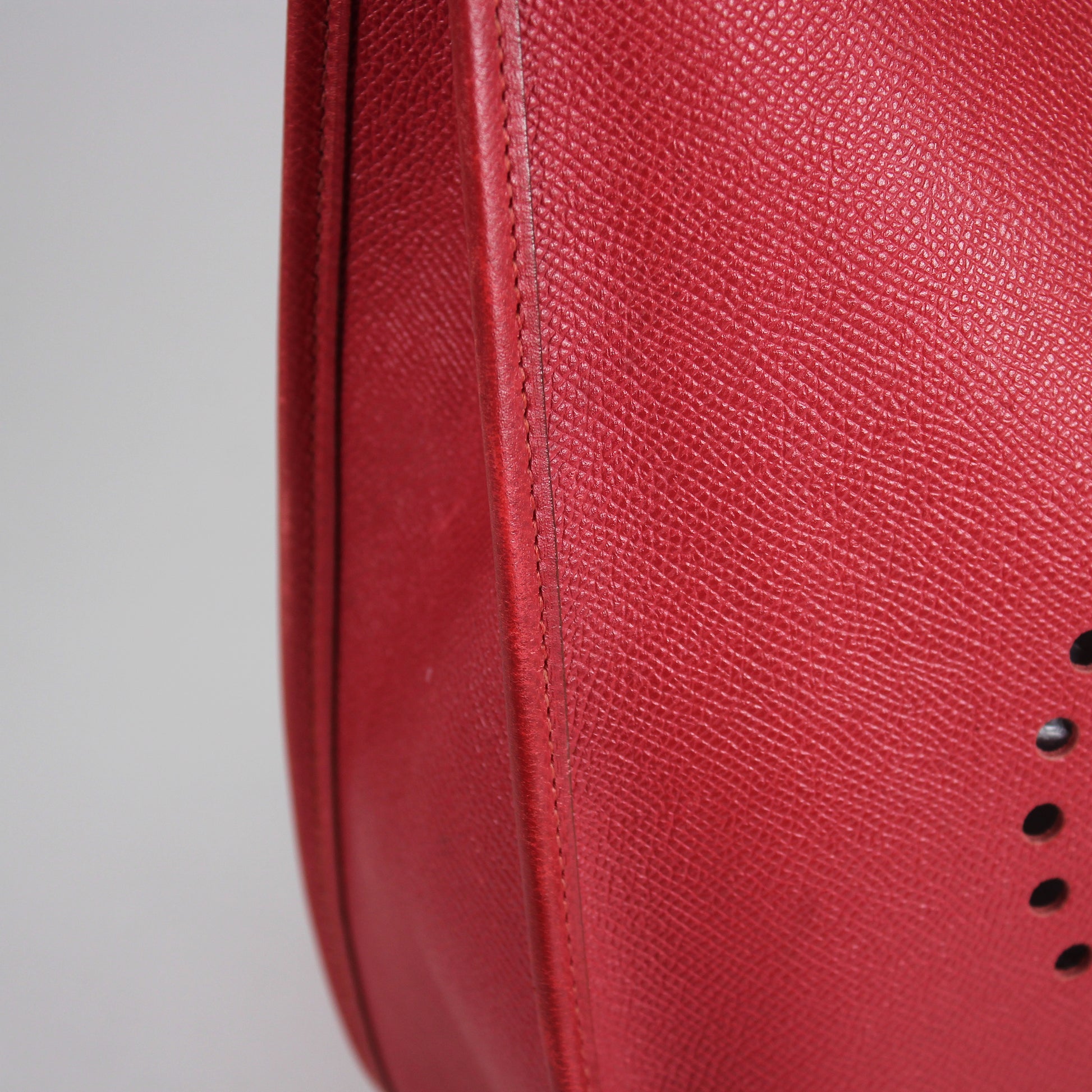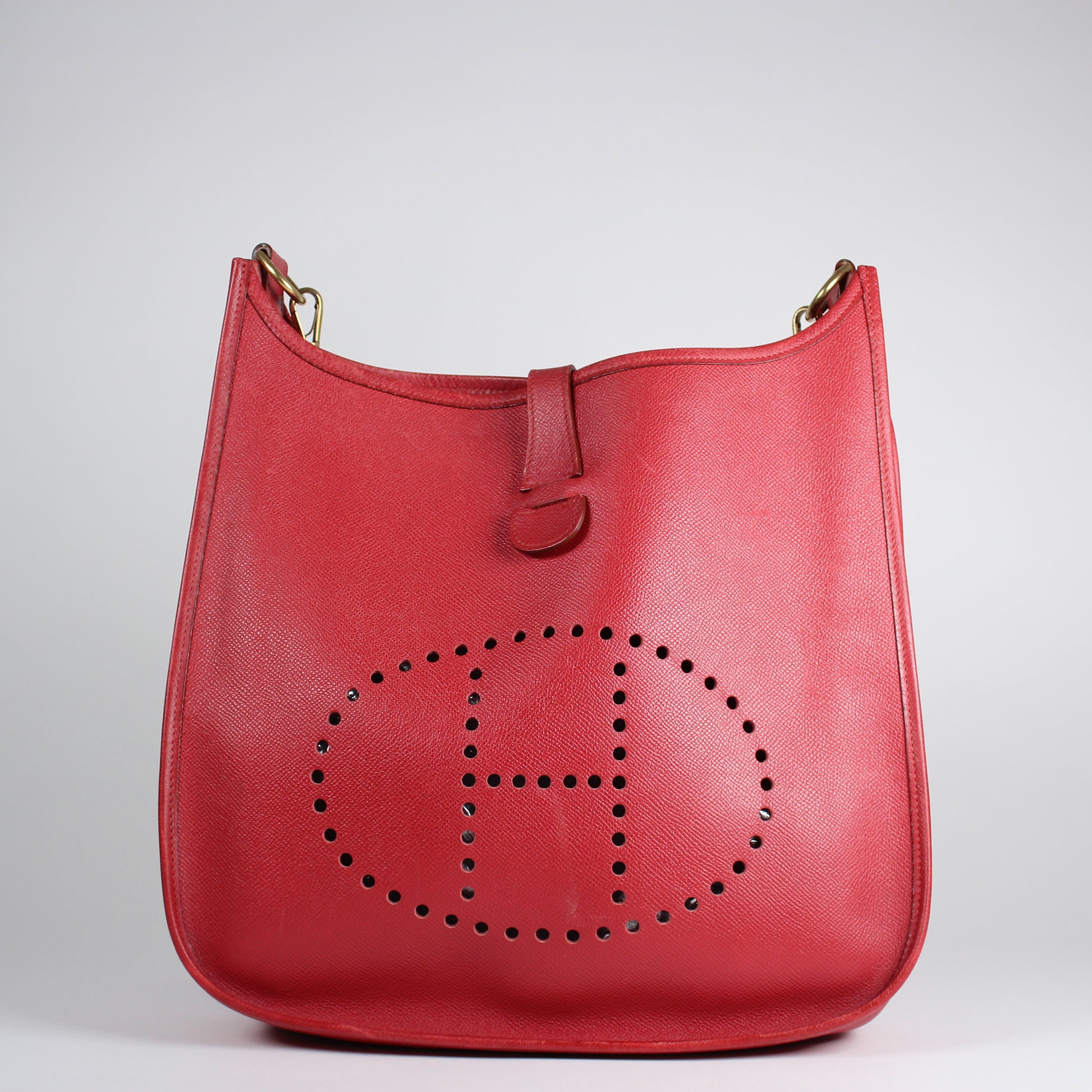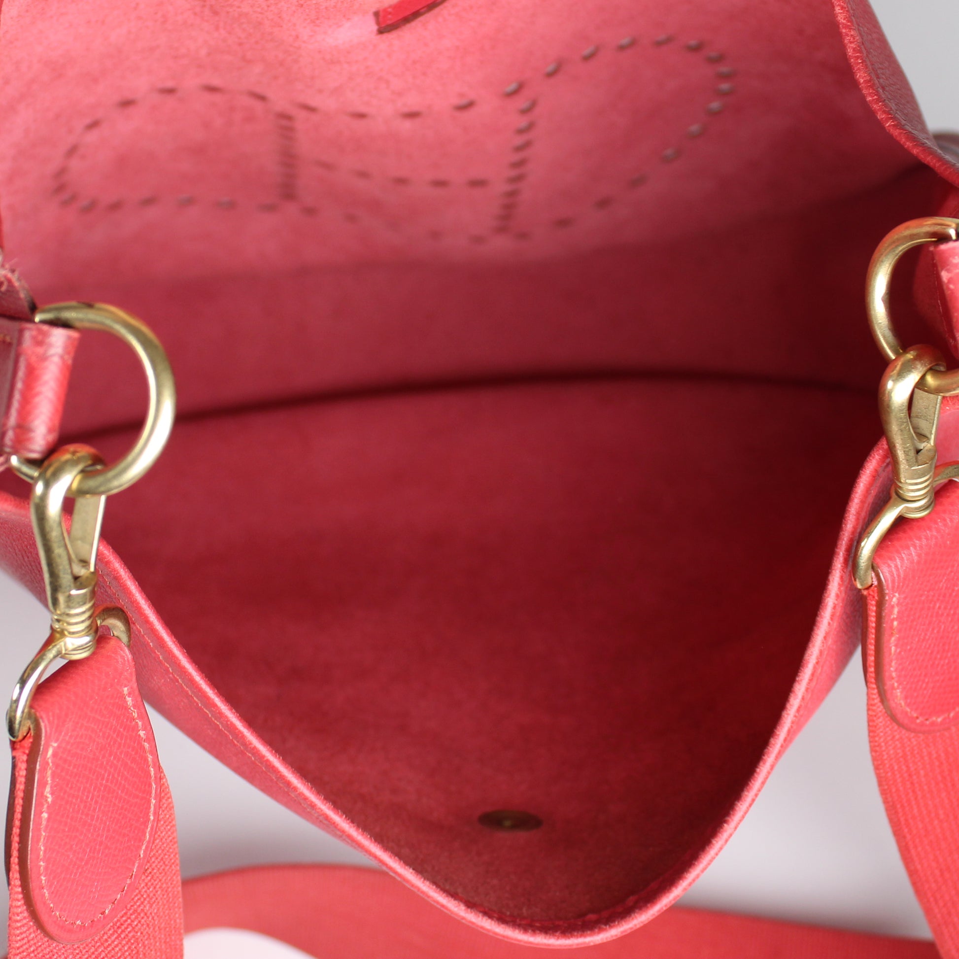 Noteworthy Features: Hermès Evelyne shoulder bag crafted in Epsom leather featuring the perforated “H” logo, snap closure, canvas strap, and unlined suede interior