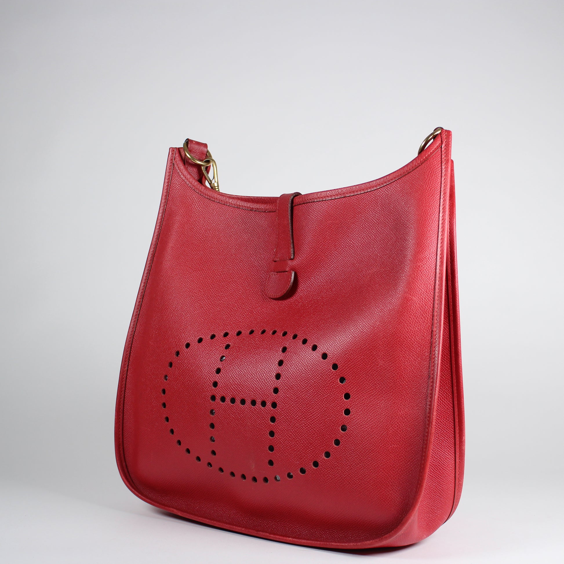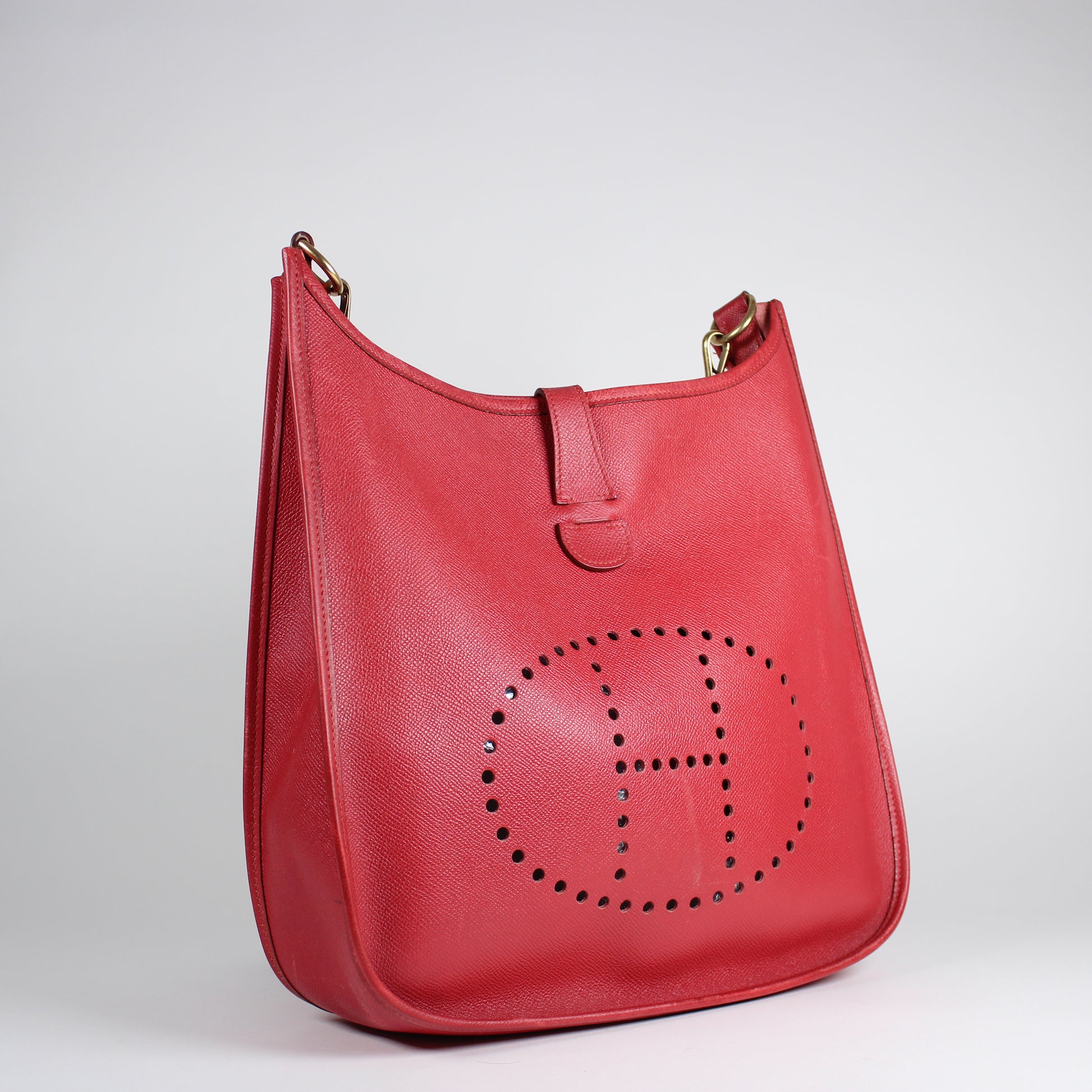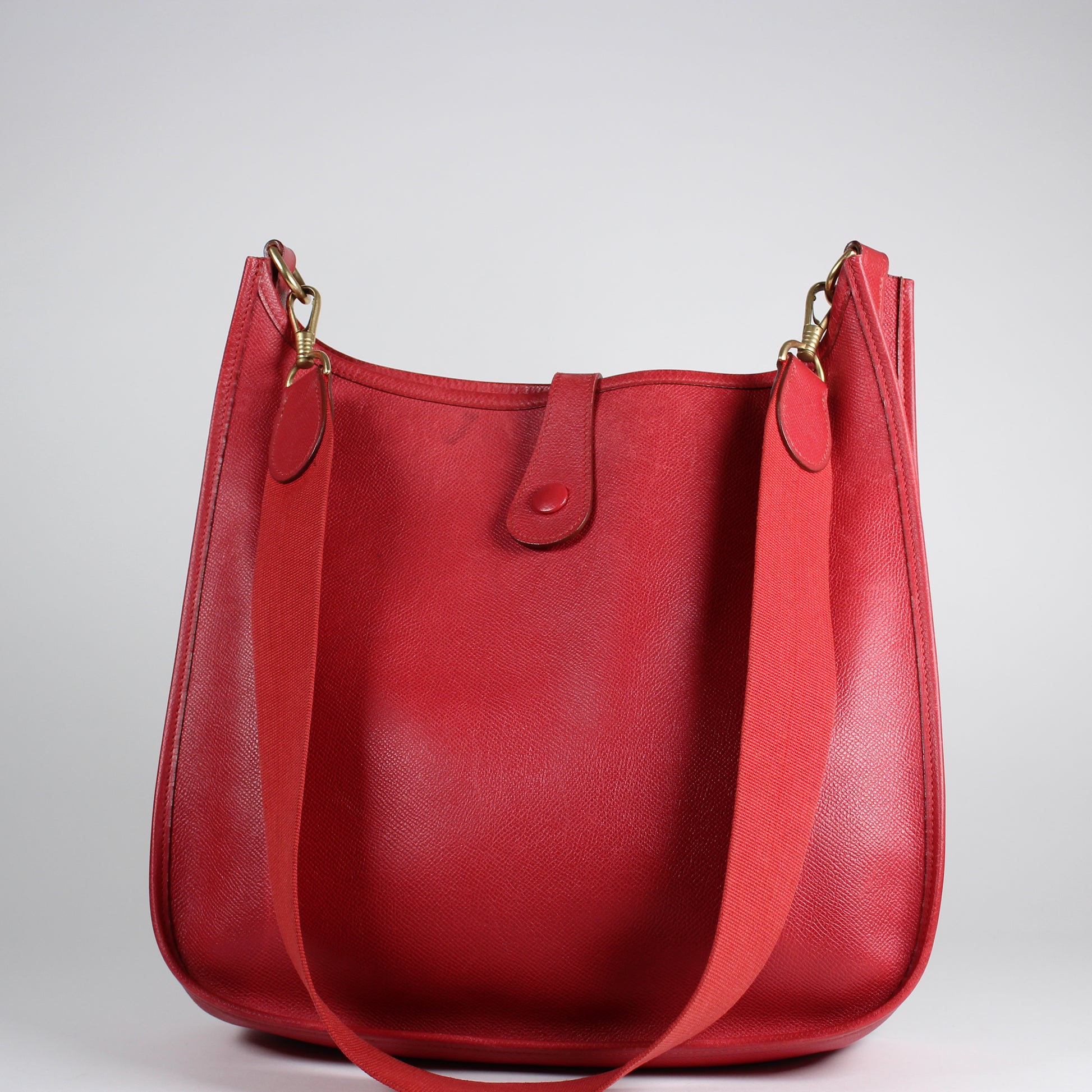 Noteworthy Features: Hermès Evelyne shoulder bag crafted in Epsom leather featuring the perforated “H” logo, snap closure, canvas strap, and unlined suede interior