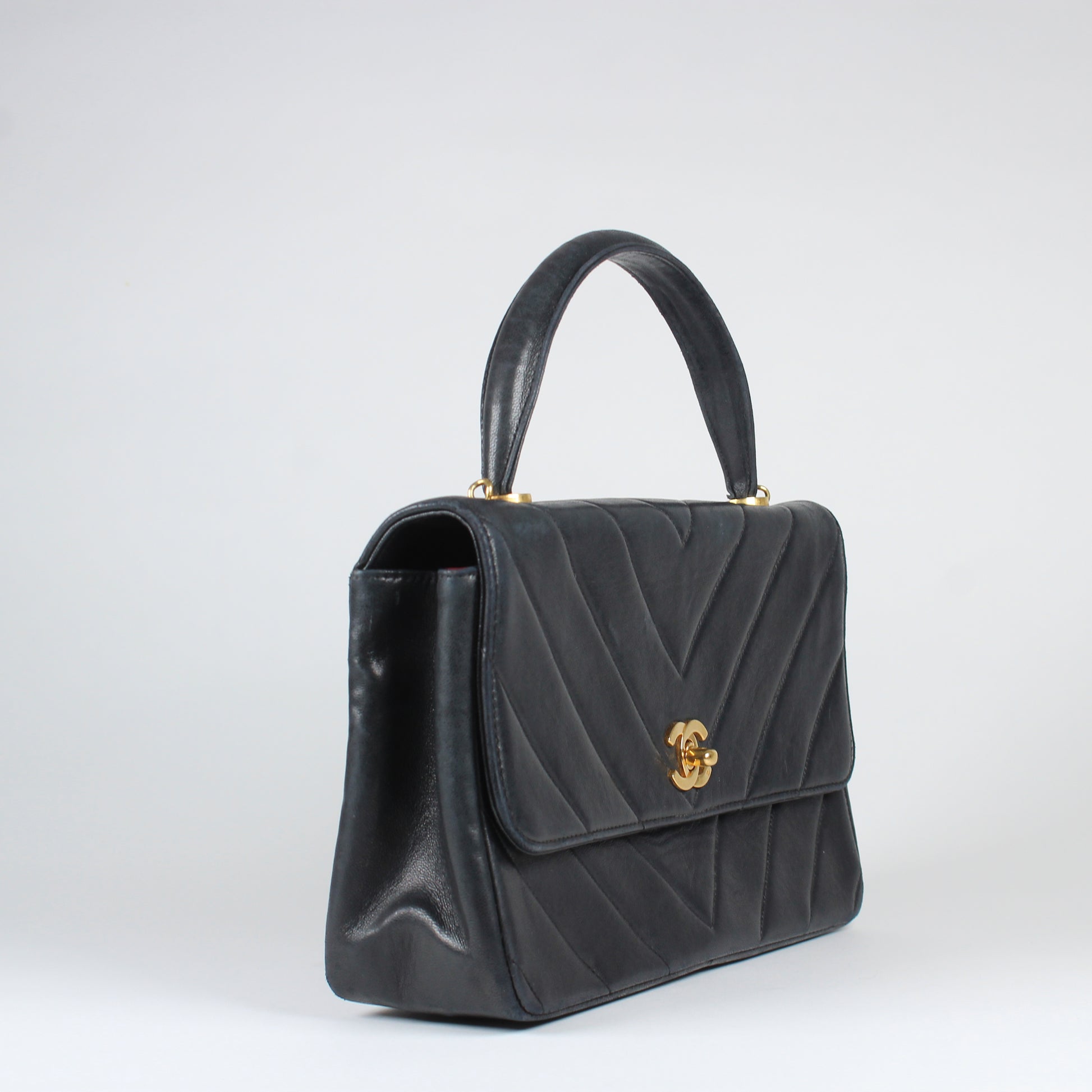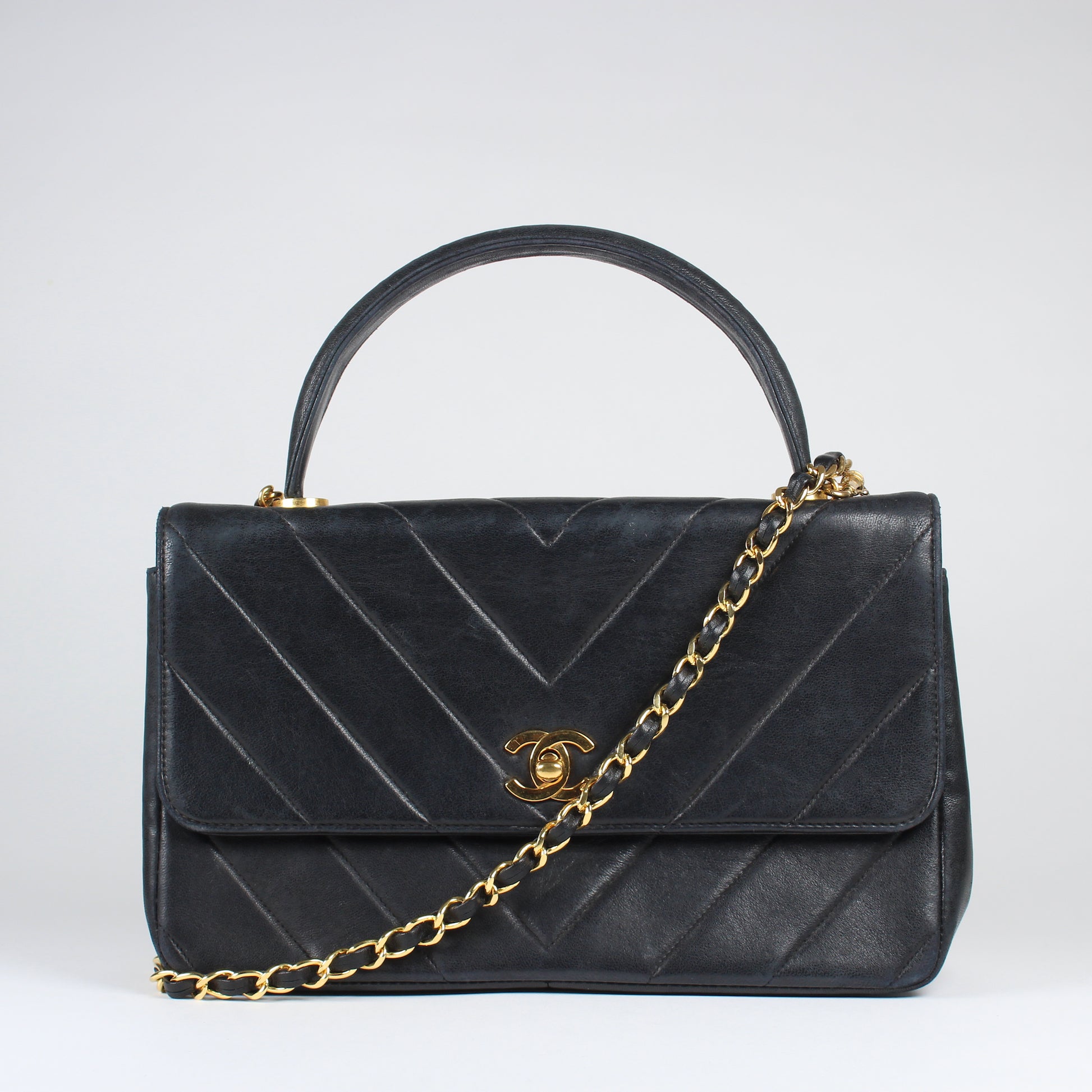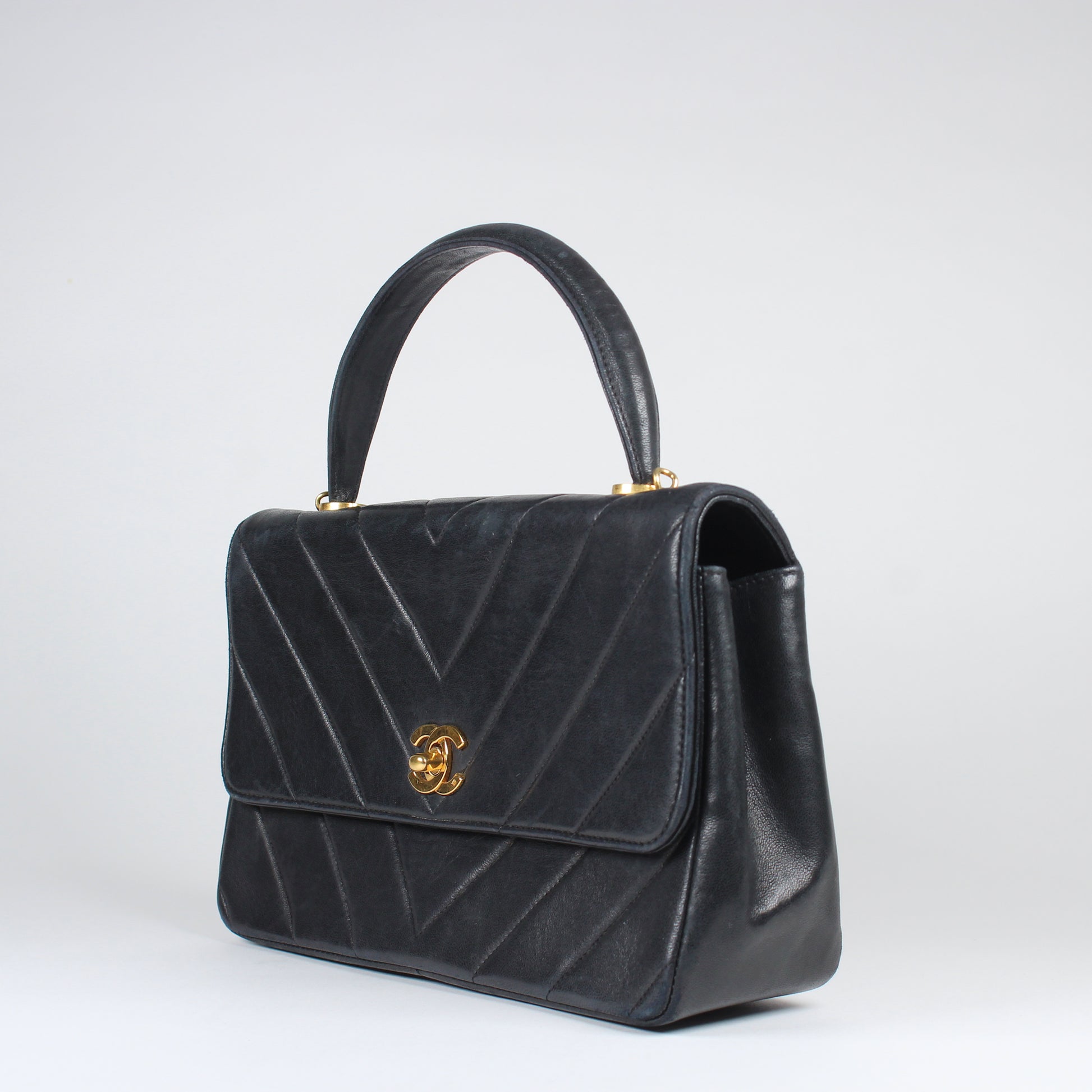 Noteworthy Features: Vintage Chanel Kelly-style top handle bag featuring chevron quilting, CC turn-lock closure, burgundy leather interior, and detachable leather-threaded chain strap