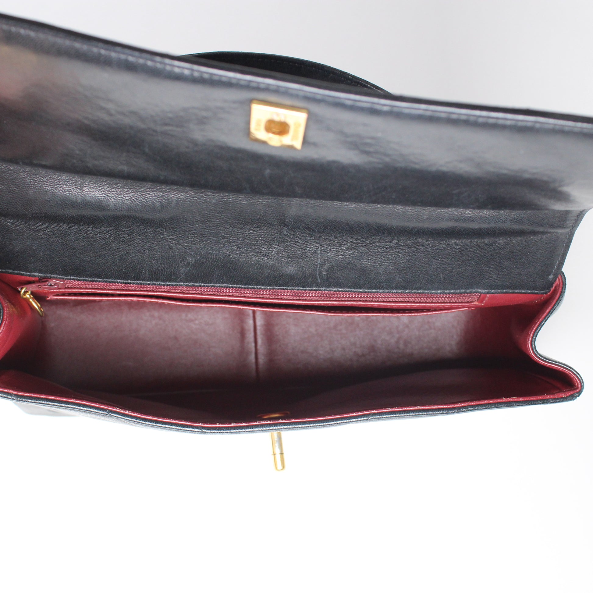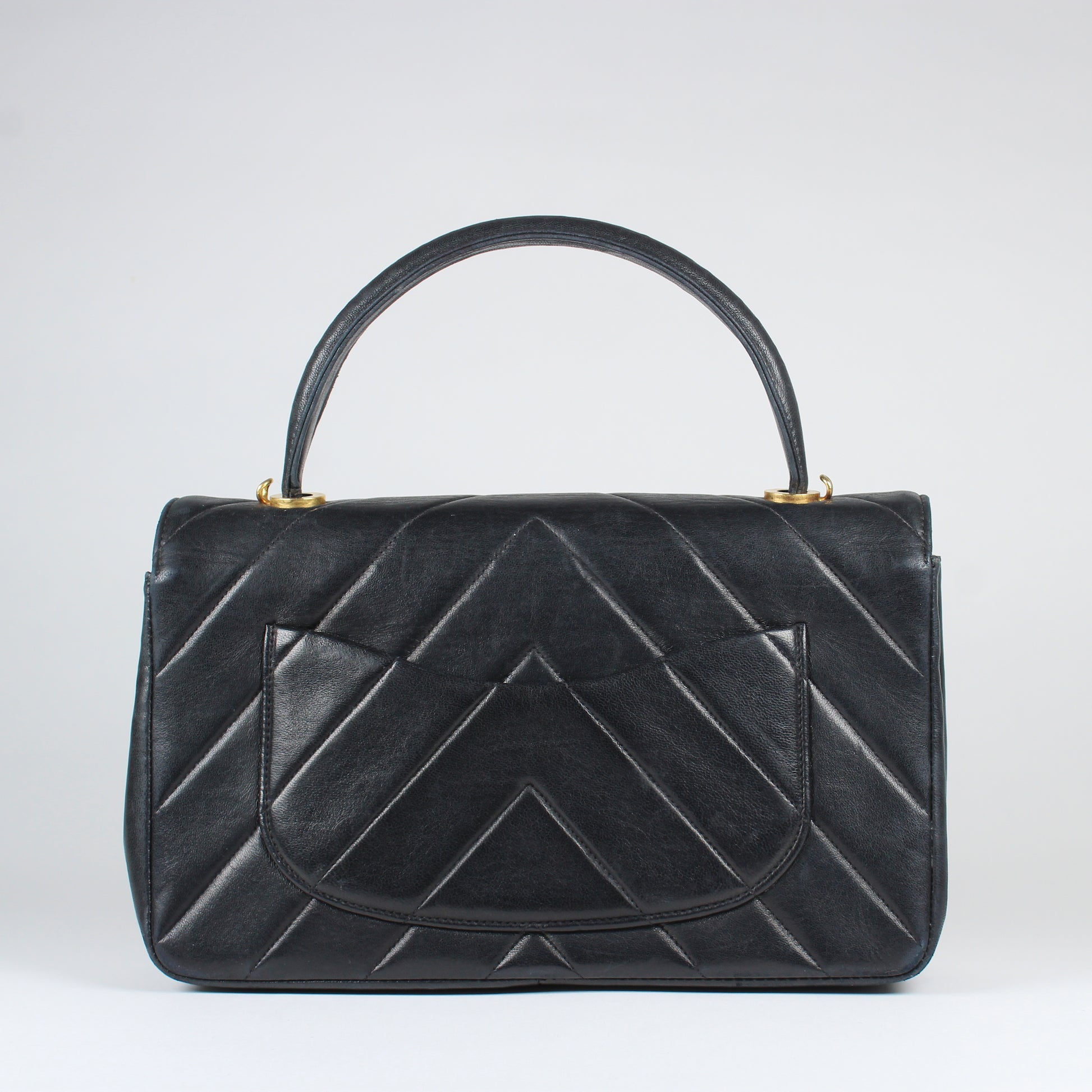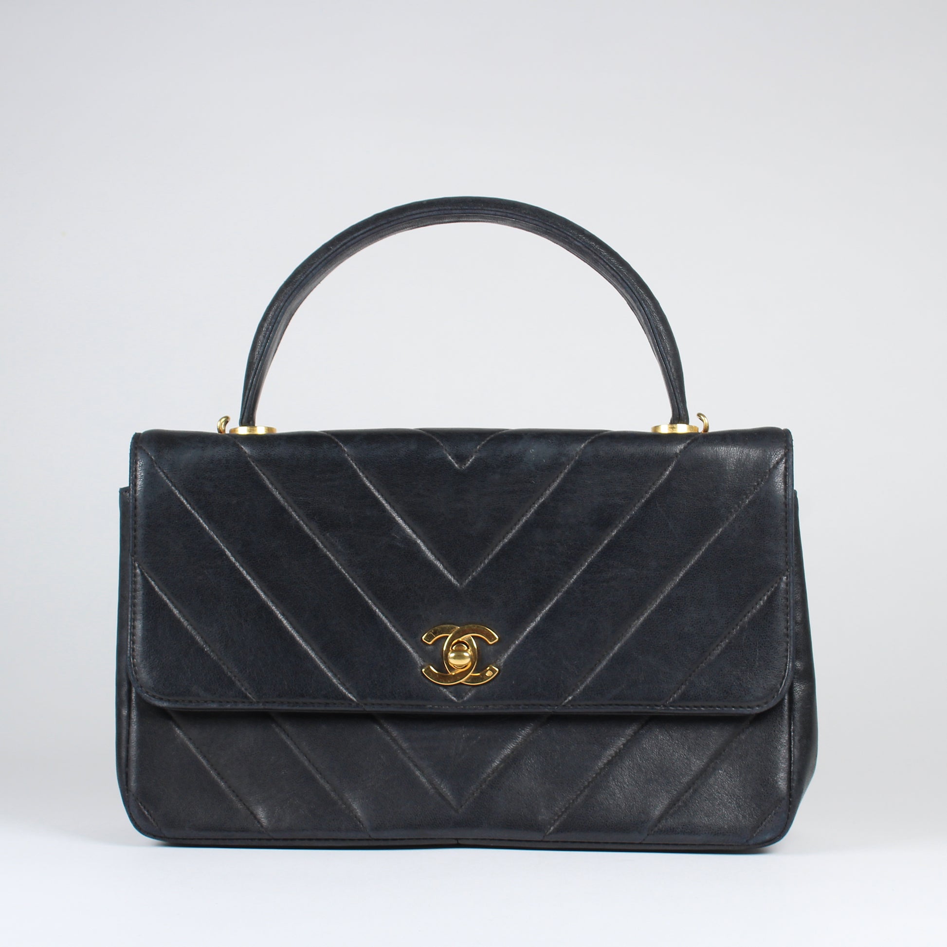 Noteworthy Features: Vintage Chanel Kelly-style top handle bag featuring chevron quilting, CC turn-lock closure, burgundy leather interior, and detachable leather-threaded chain strap