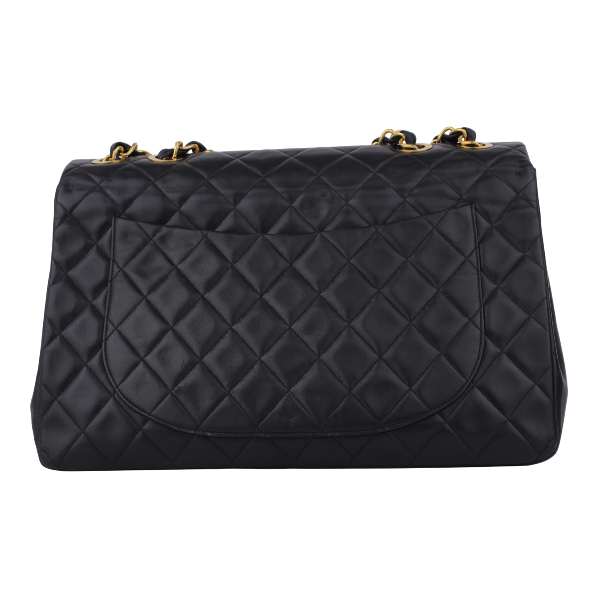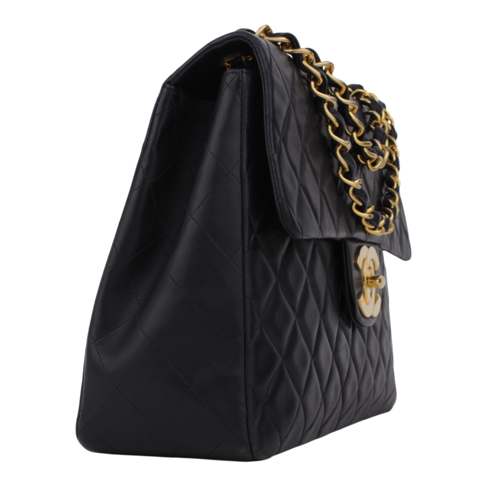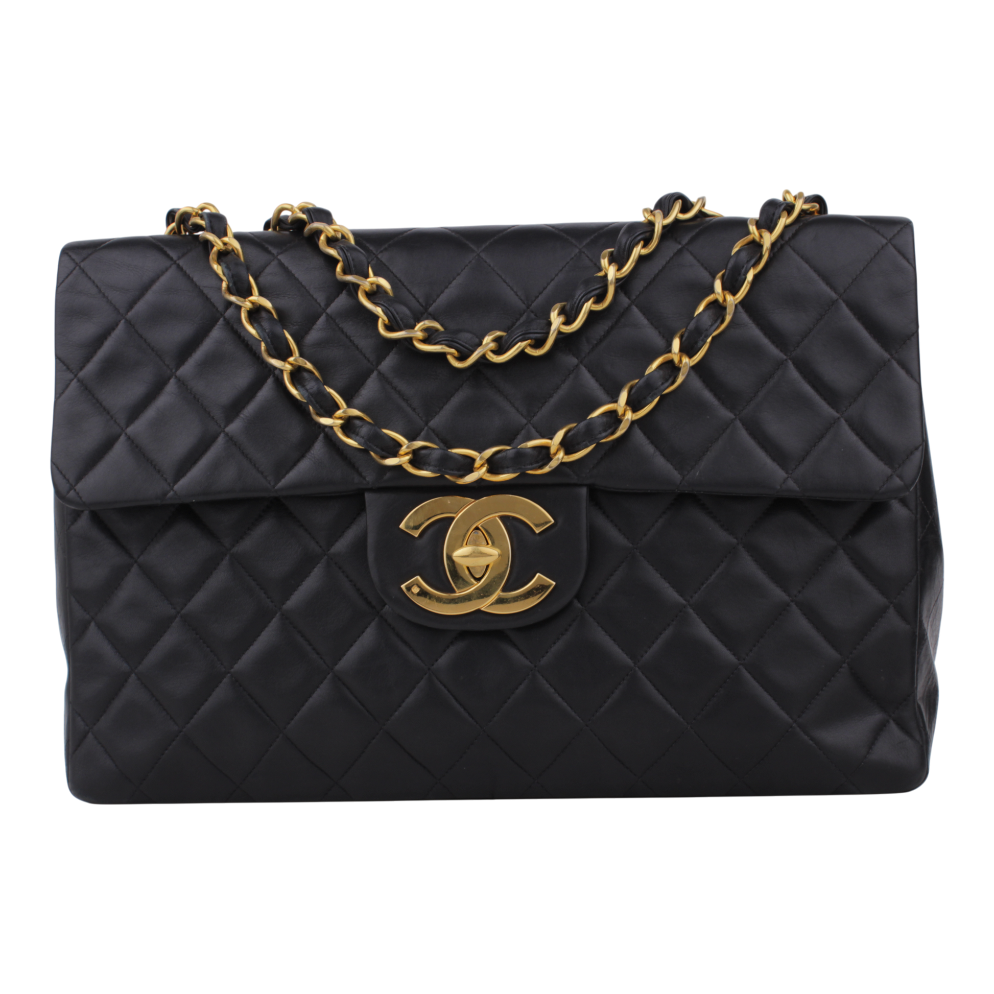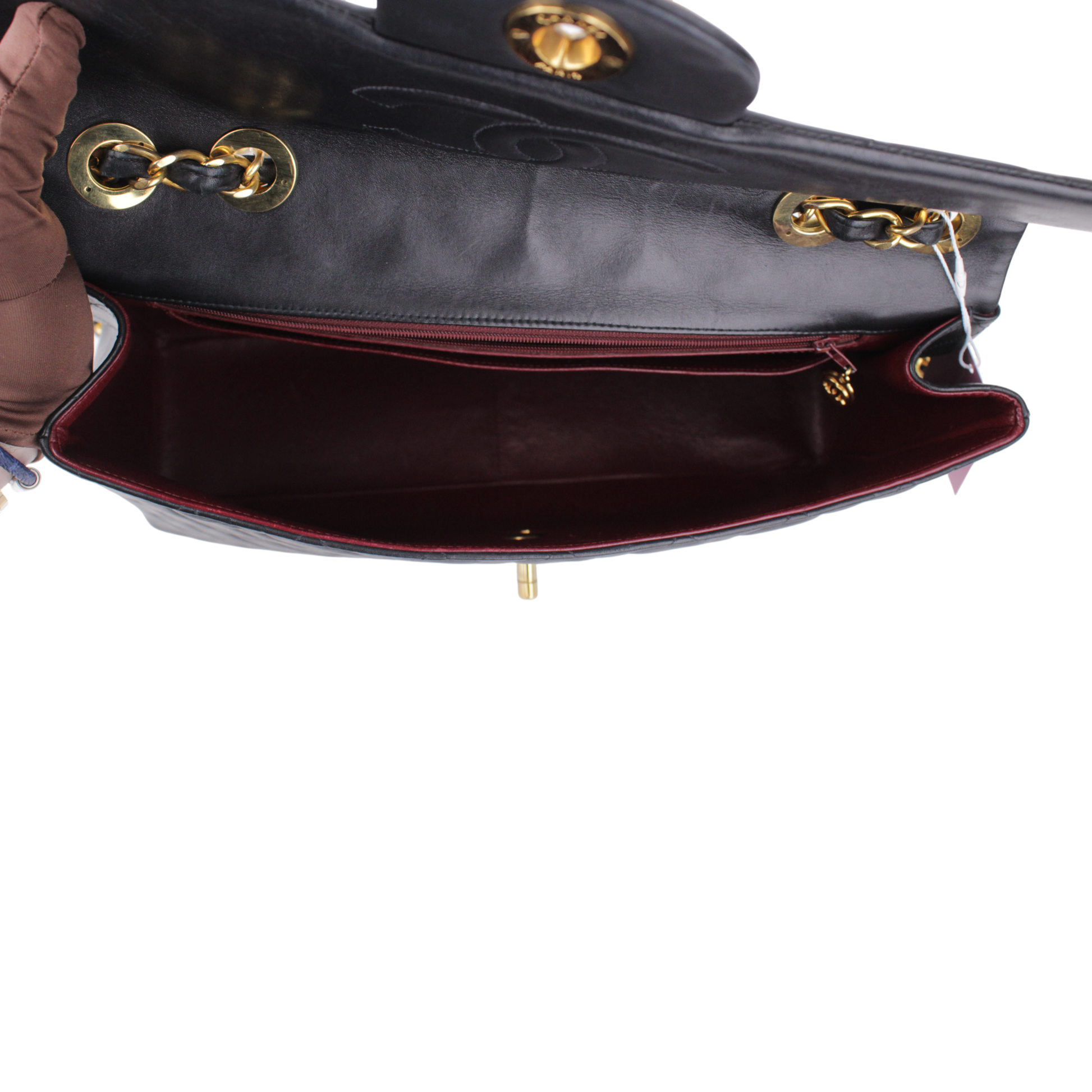Noteworthy Features: Iconic oversized Single Flap silhouette featuring the rare 24k gold plated hardware and signature burgundy leather interior.