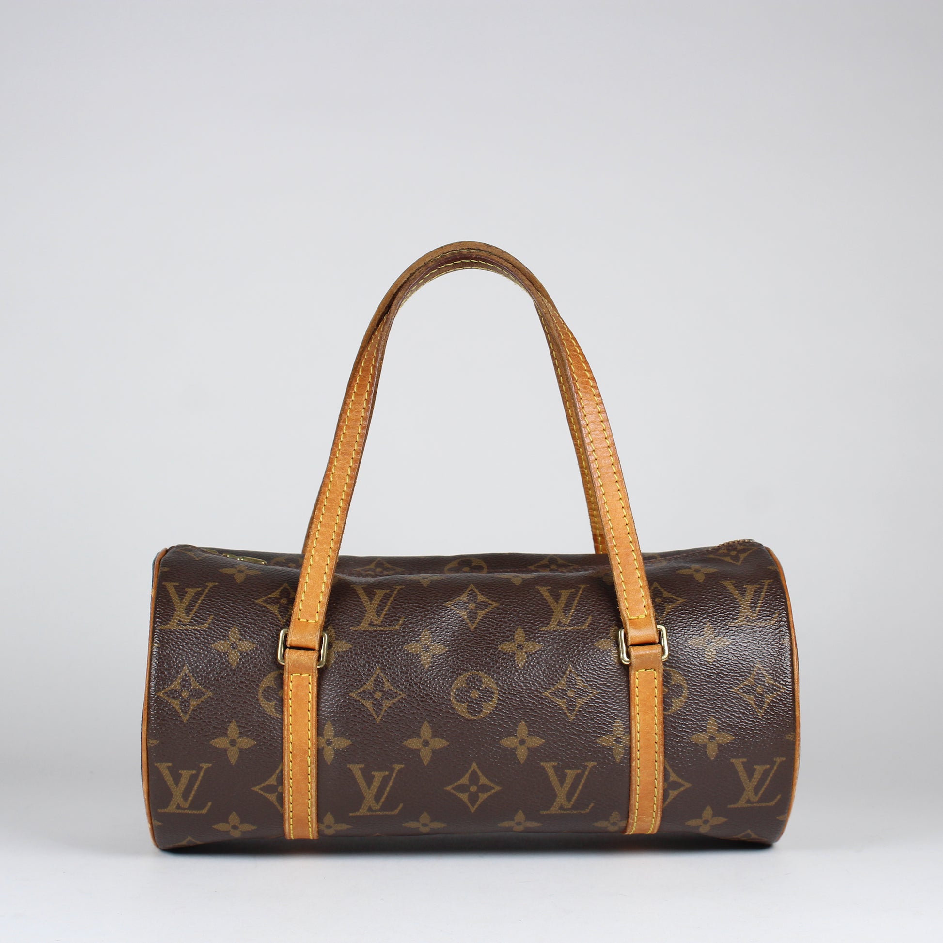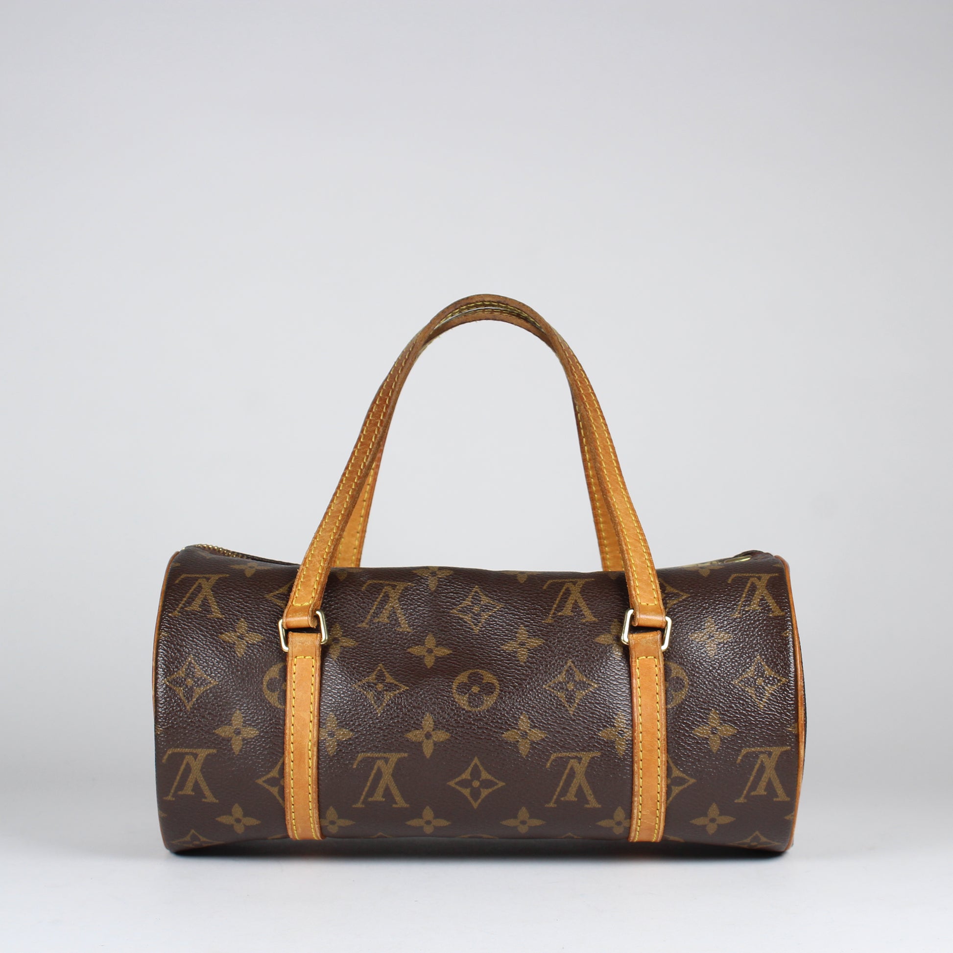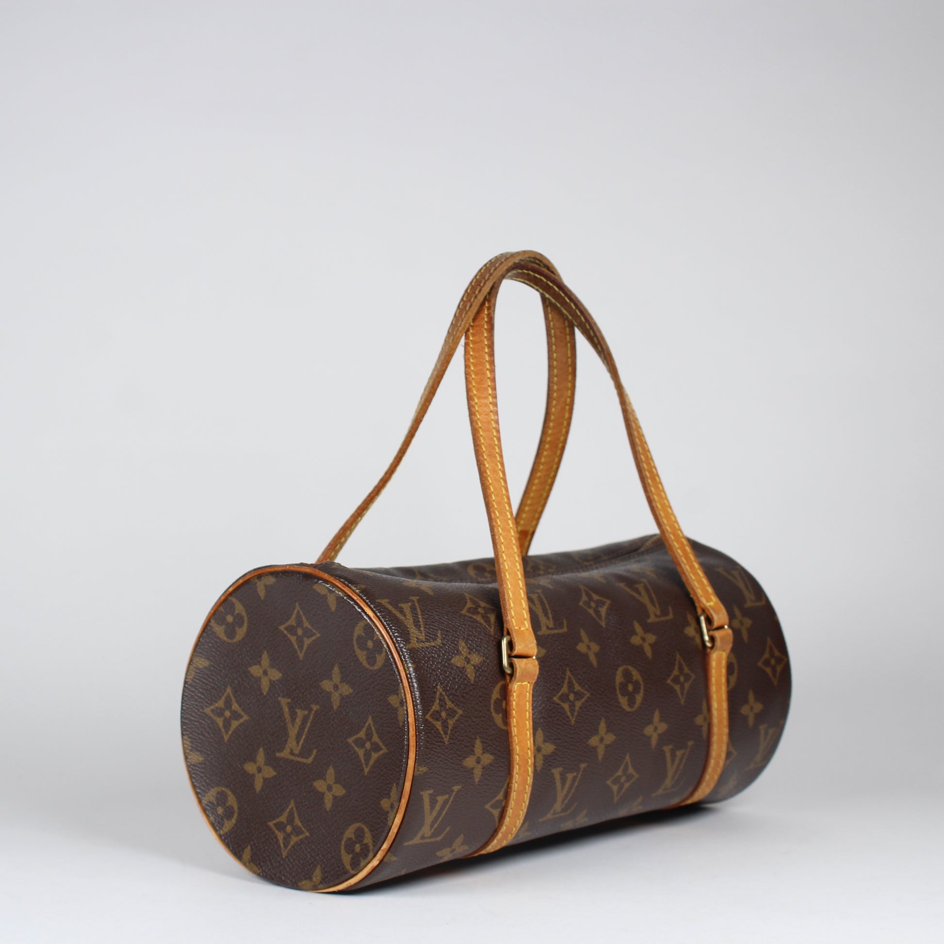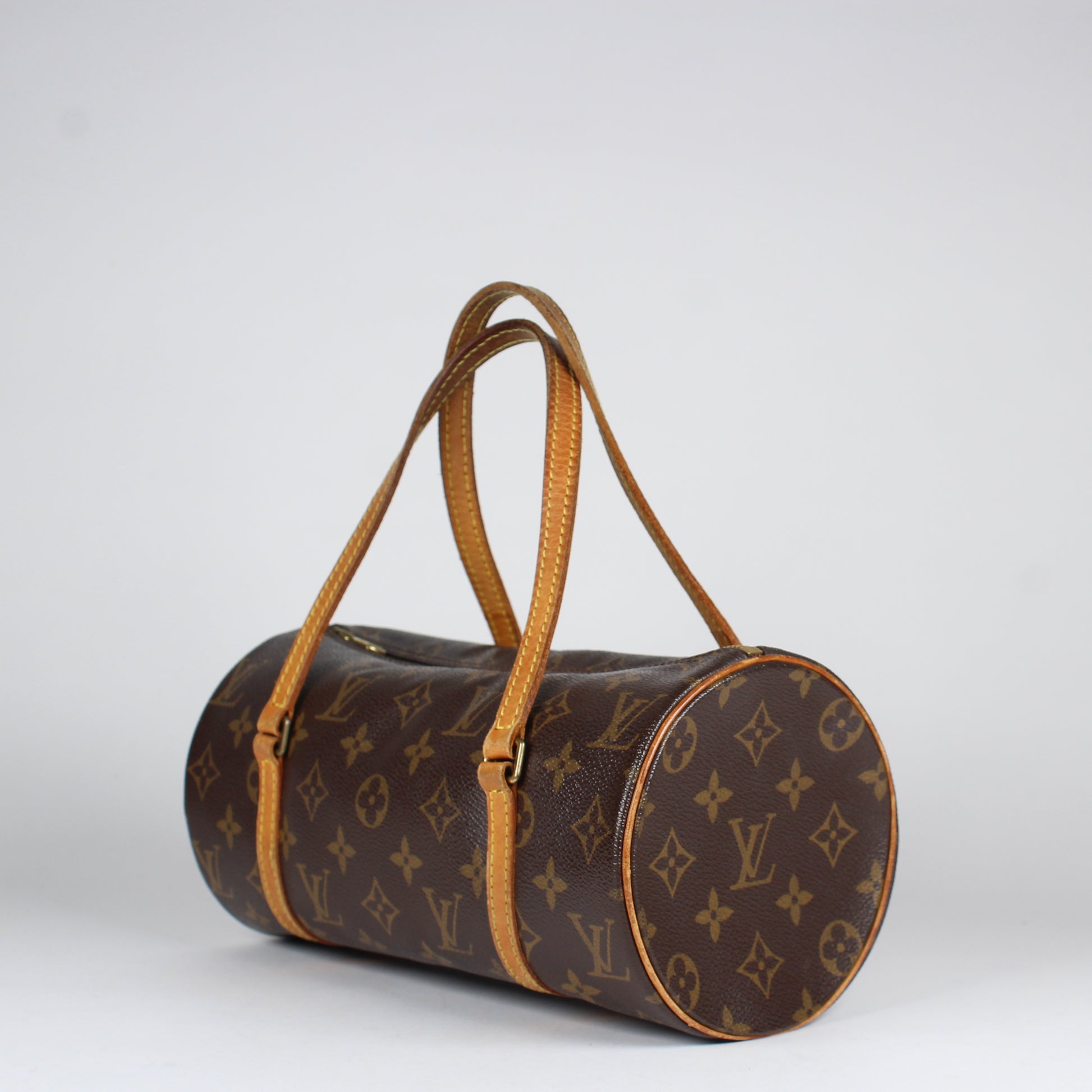 Noteworthy Features: Classic cylindrical silhouette with top zip closure and dual rolled leather handles