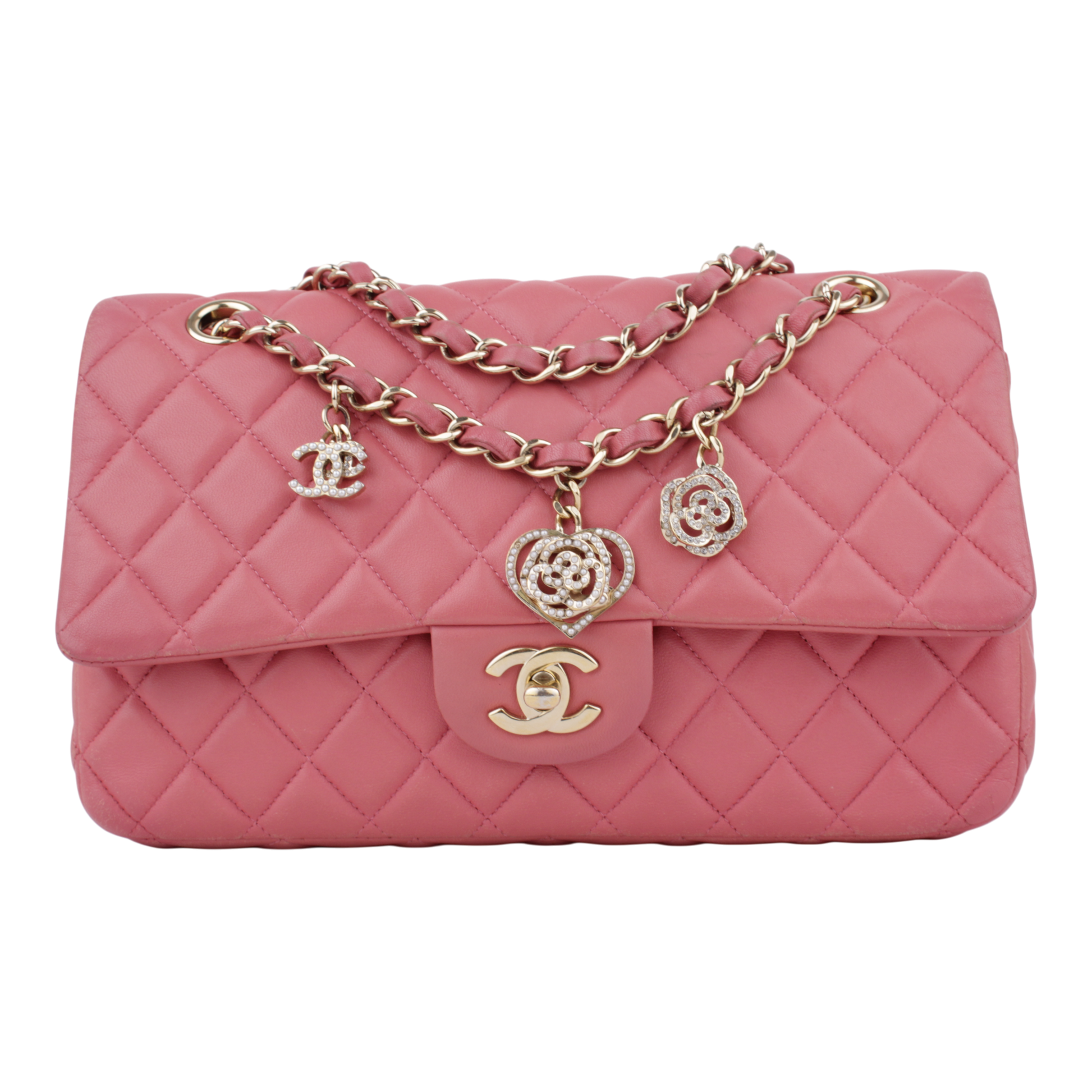Noteworthy Features: Limited edition Valentine's Collection; features iconic heart, camellia, and CC charms with crystal/pearl embellishments on the chain strap.