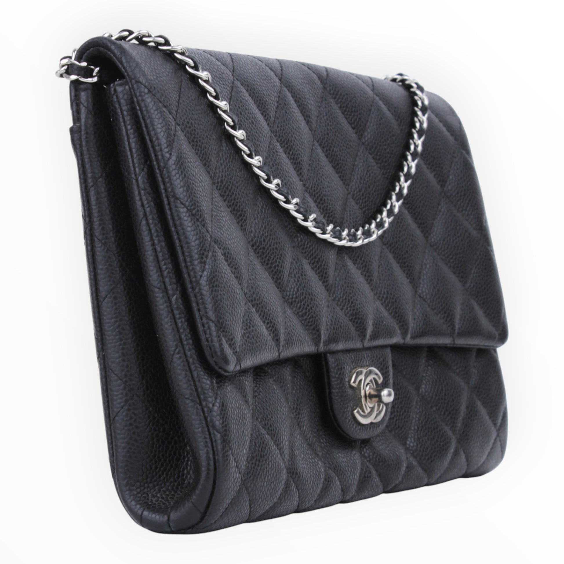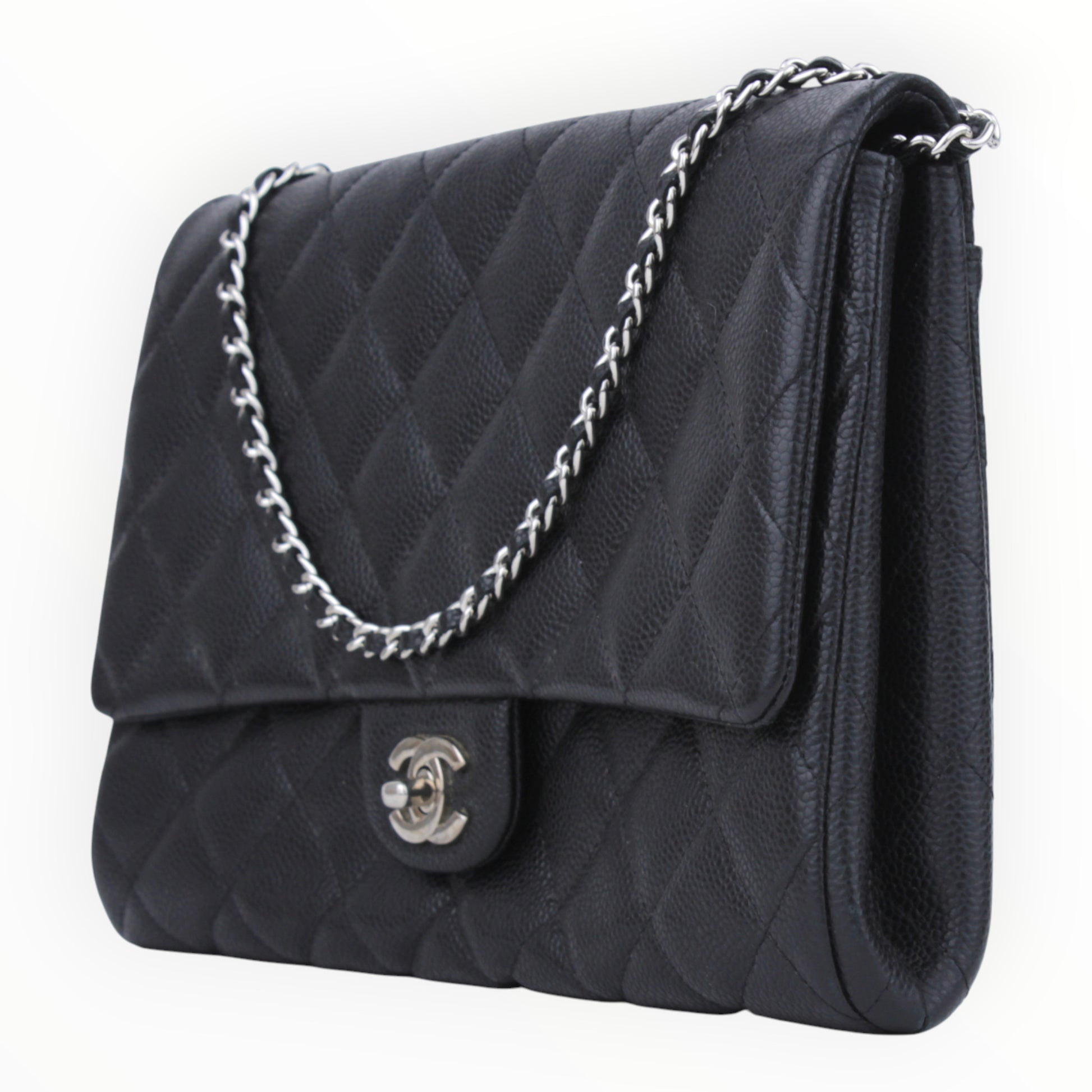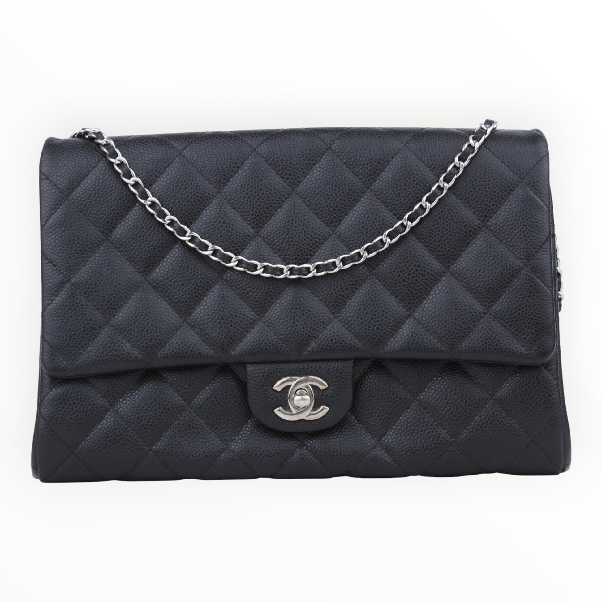 Noteworthy Features: Classic single flap silhouette in durable quilted caviar leather featuring a signature CC turn-lock and a silver-tone chain-link shoulder strap.