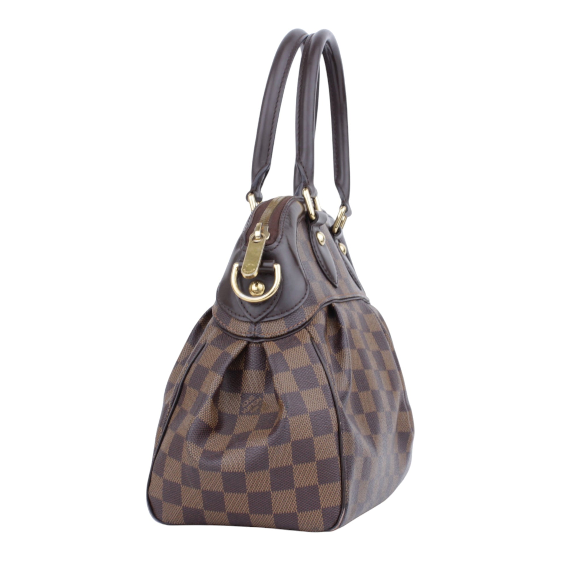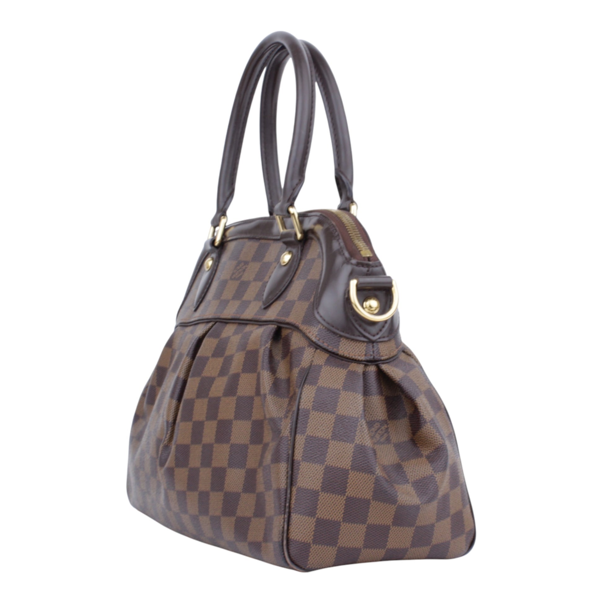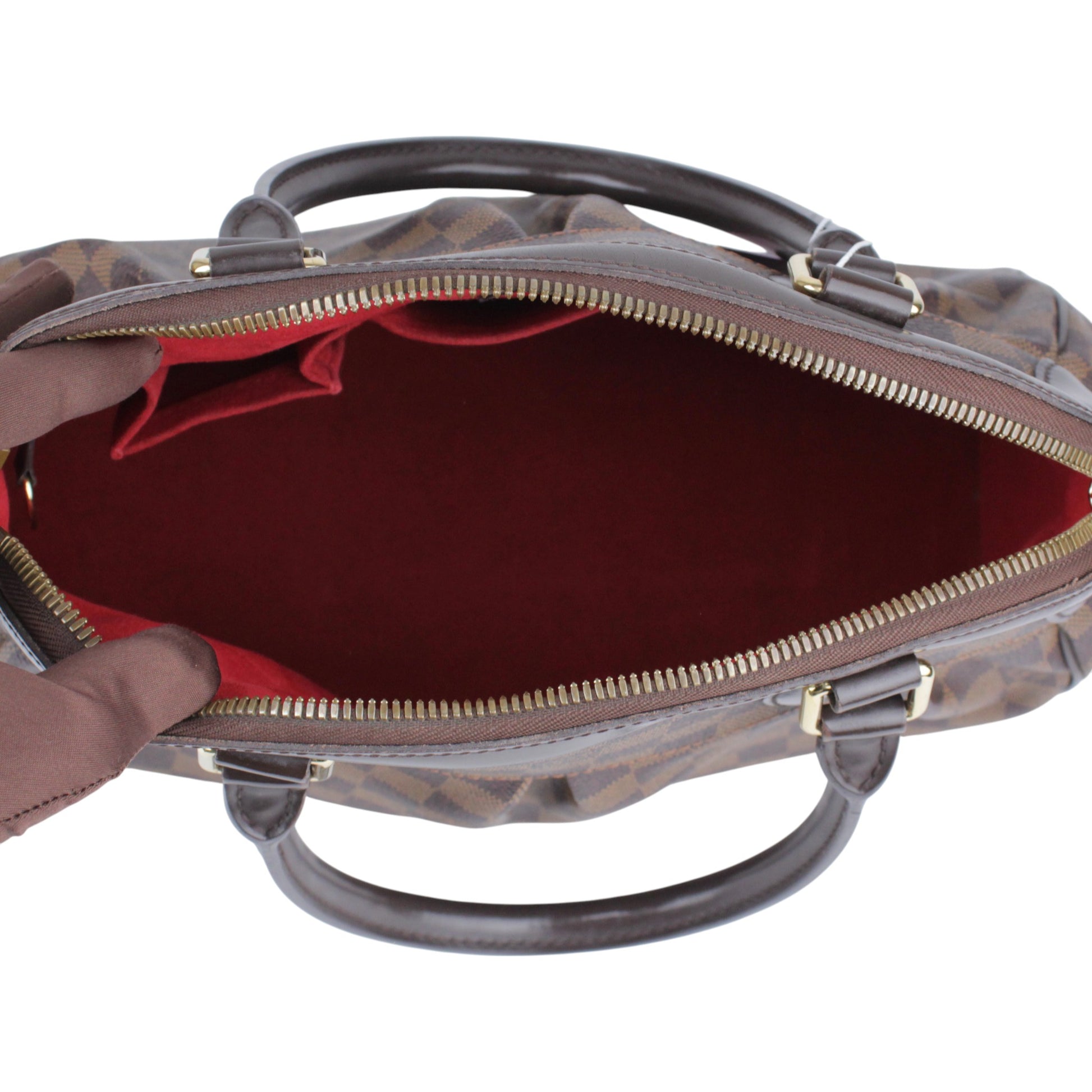 Noteworthy Features: Louis Vuitton Trevi PM featuring a pleated silhouette, rounded leather top handles, vibrant red Alcantara interior lining, and protective base studs.