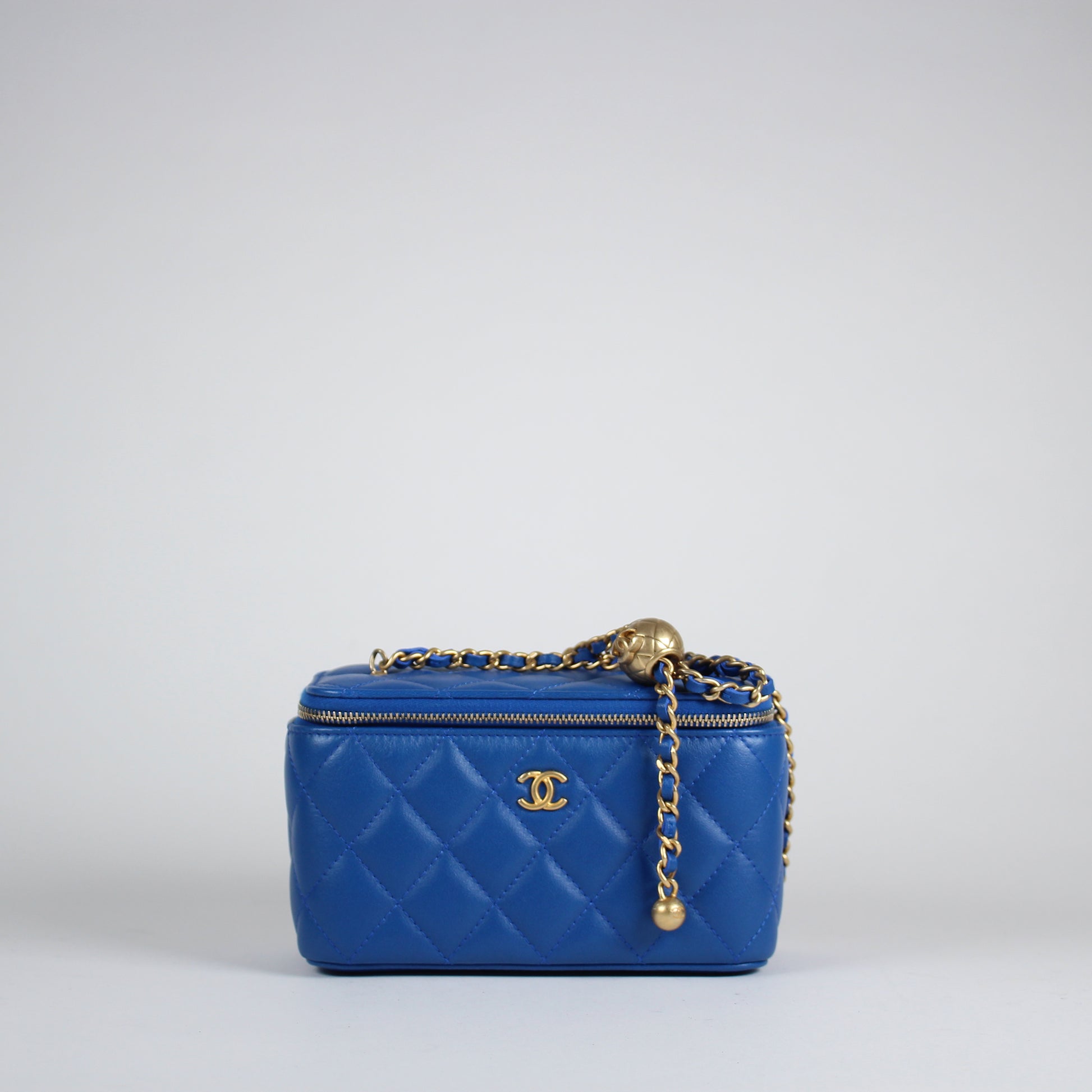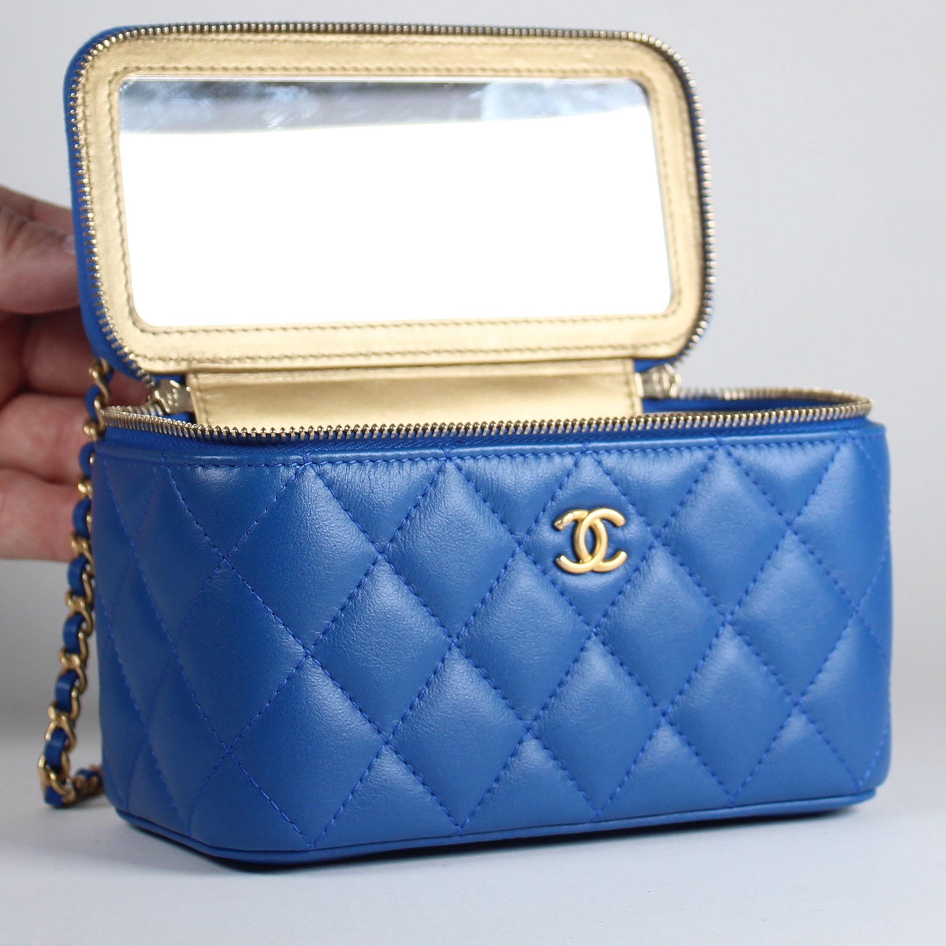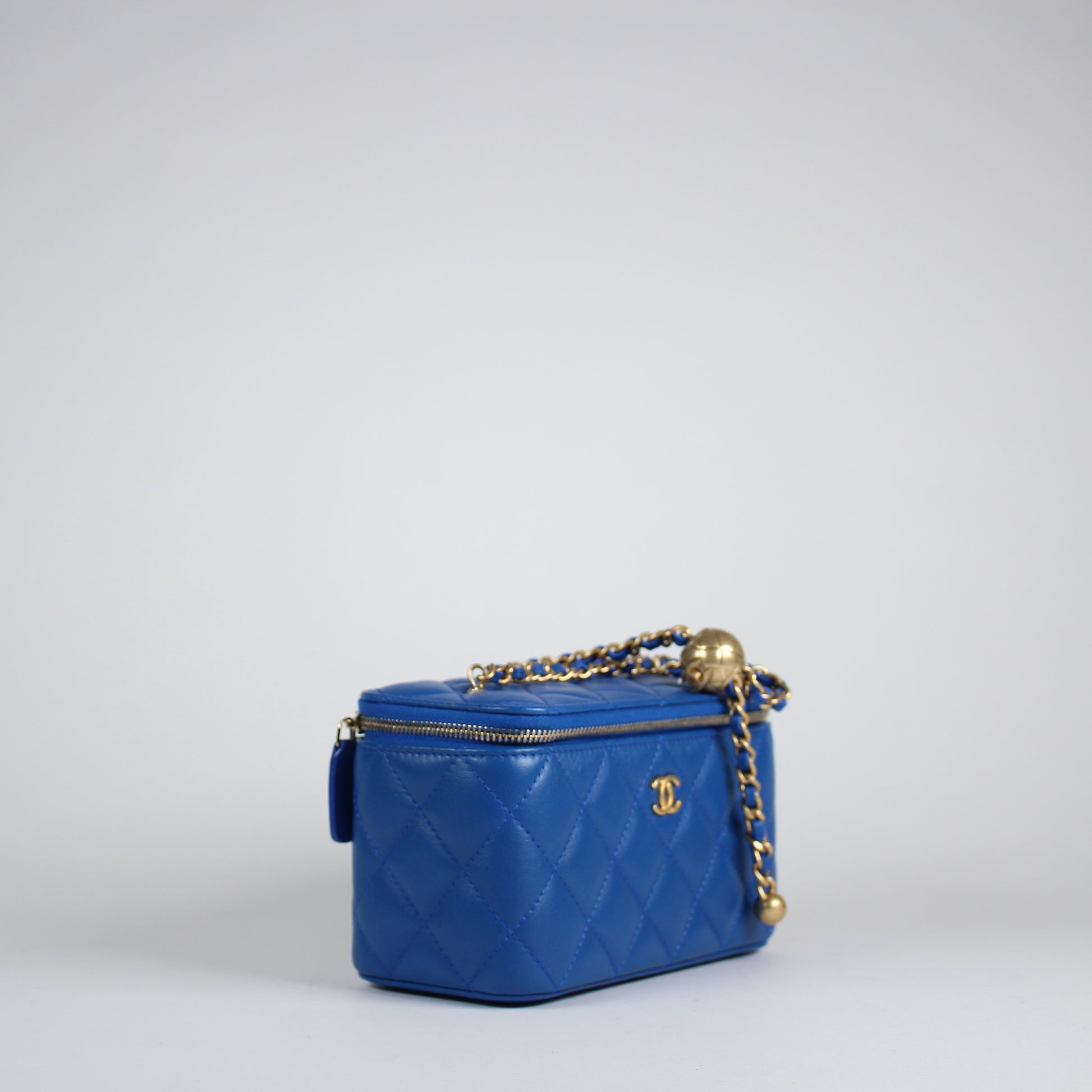 Noteworthy Features: Structured vanity-on-chain design featuring zip-around closure, CC logo detail, adjustable chain strap with signature quilted ball accent, and built-in mirror under the lid