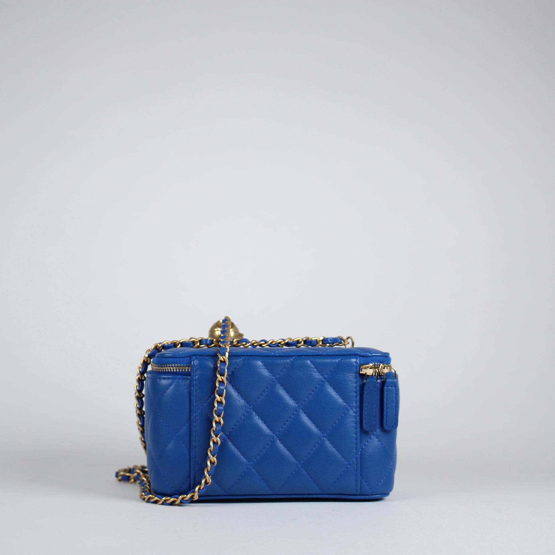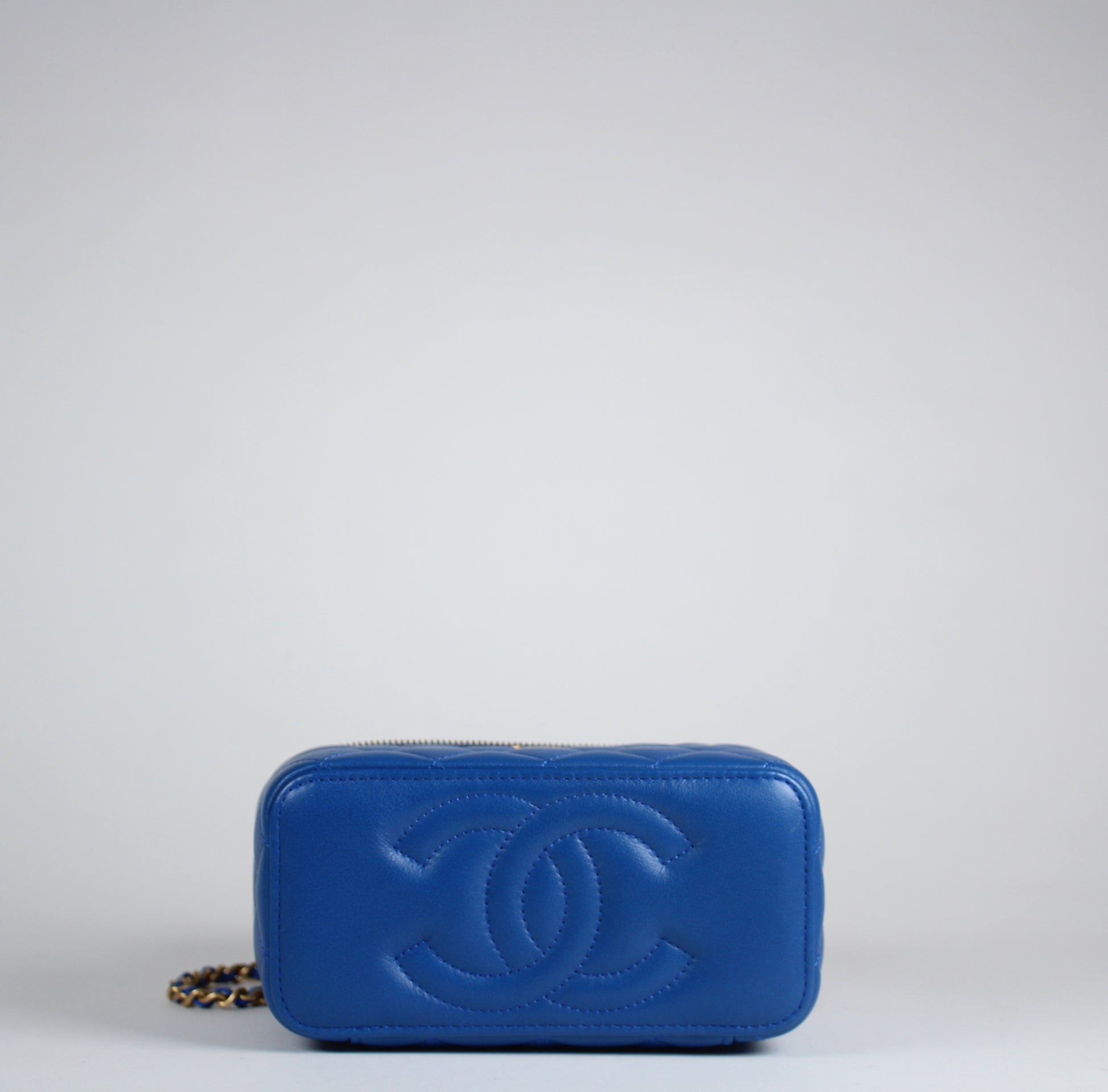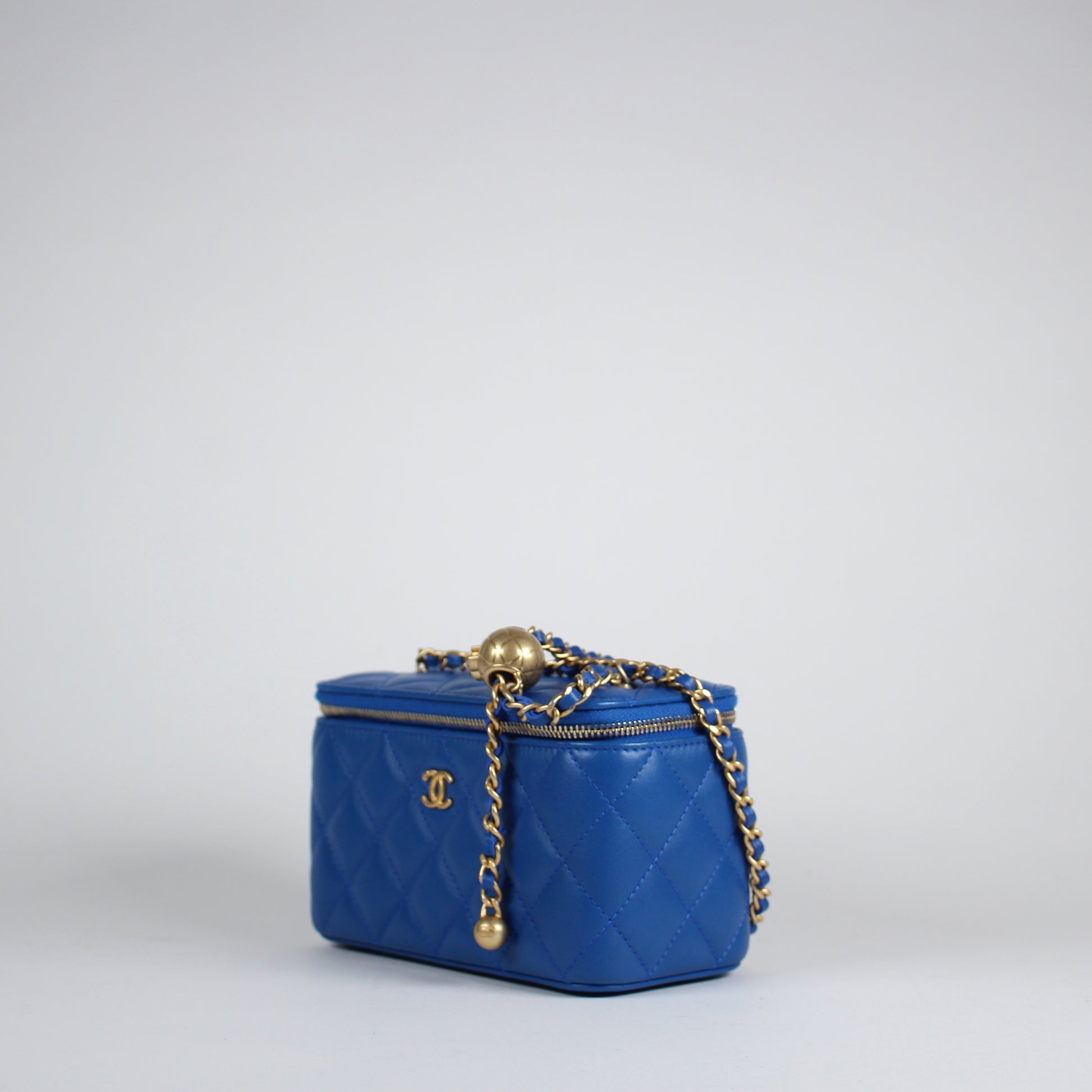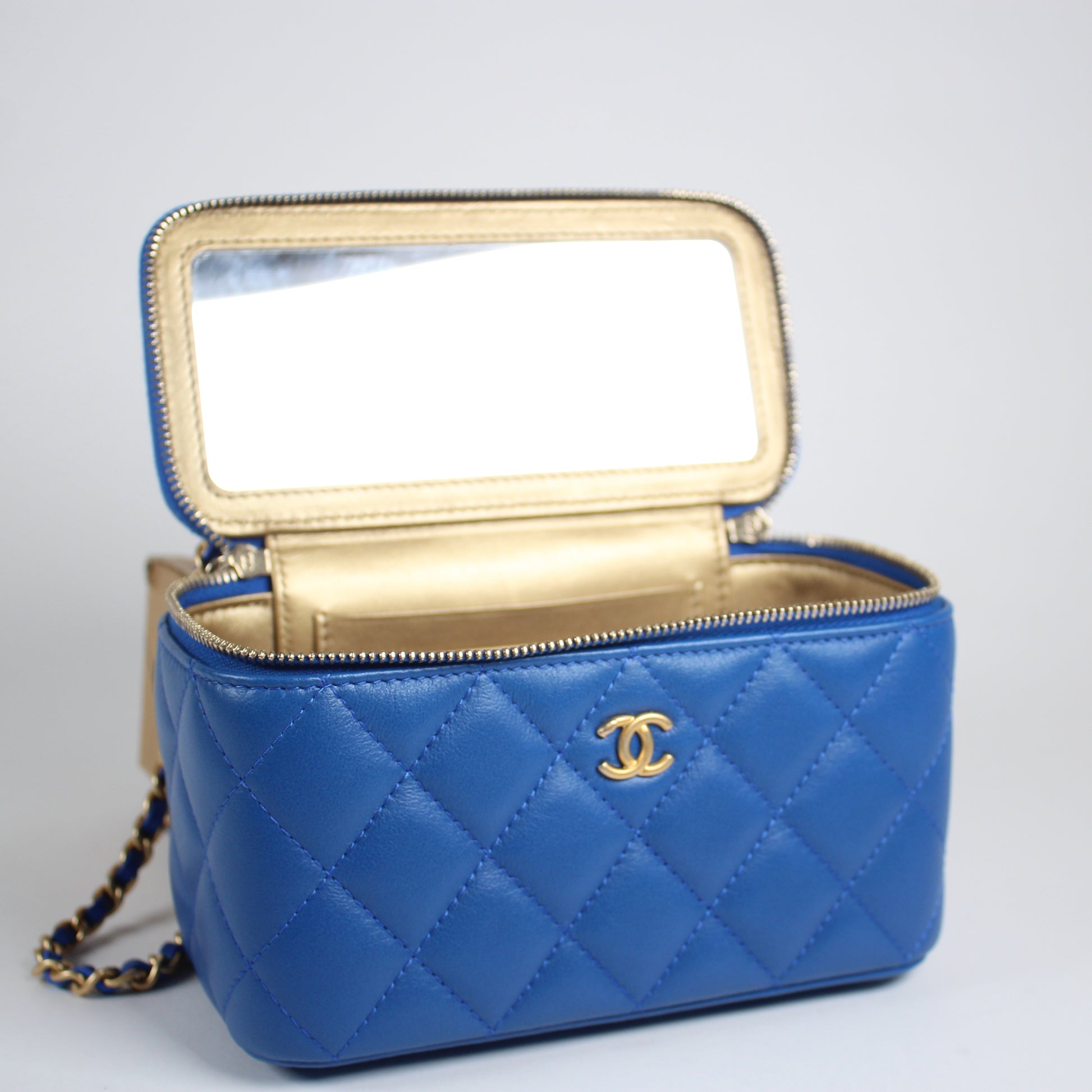 Noteworthy Features: Structured vanity-on-chain design featuring zip-around closure, CC logo detail, adjustable chain strap with signature quilted ball accent, and built-in mirror under the lid