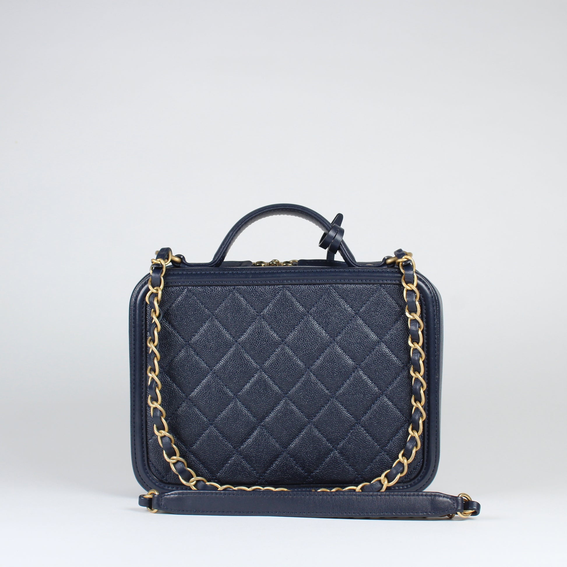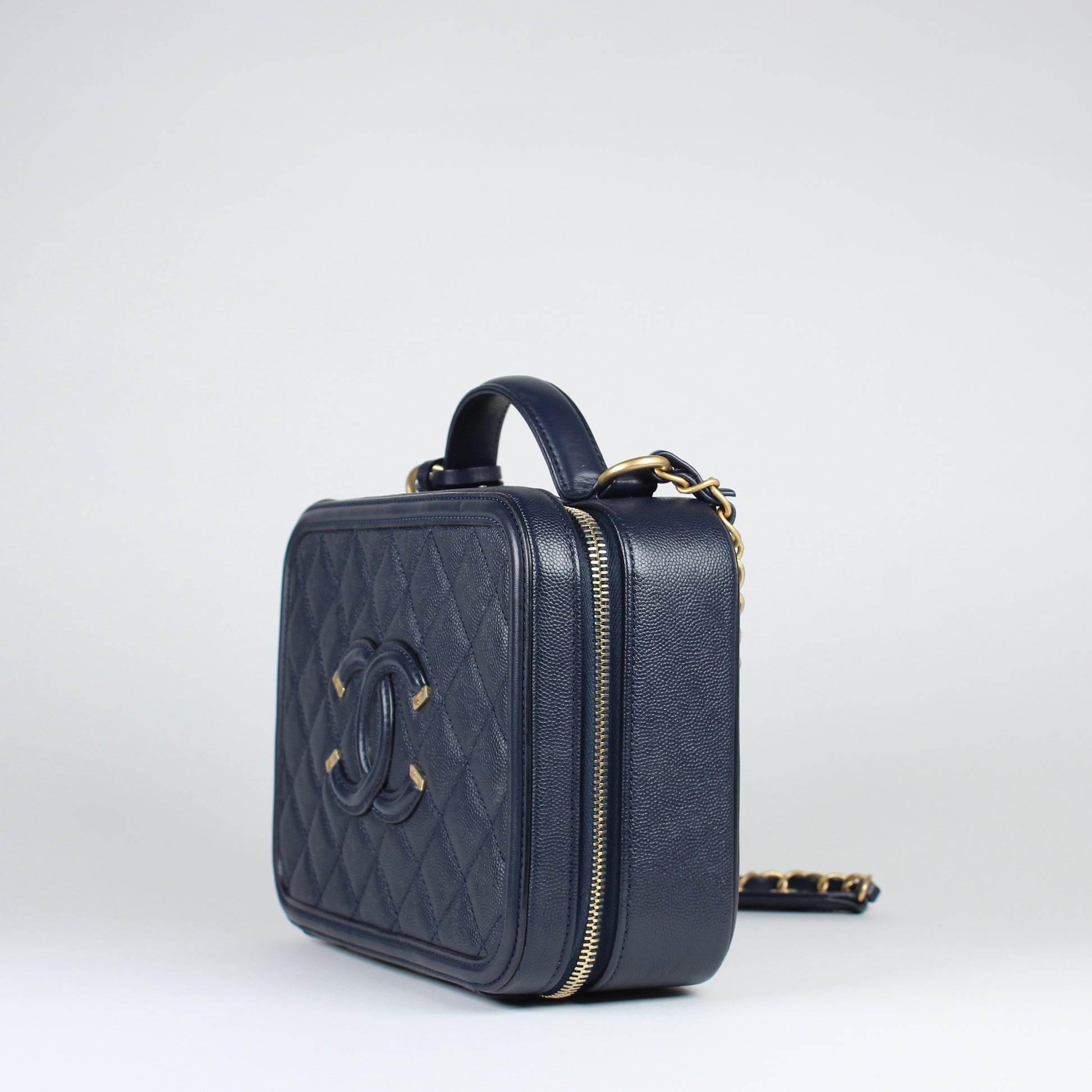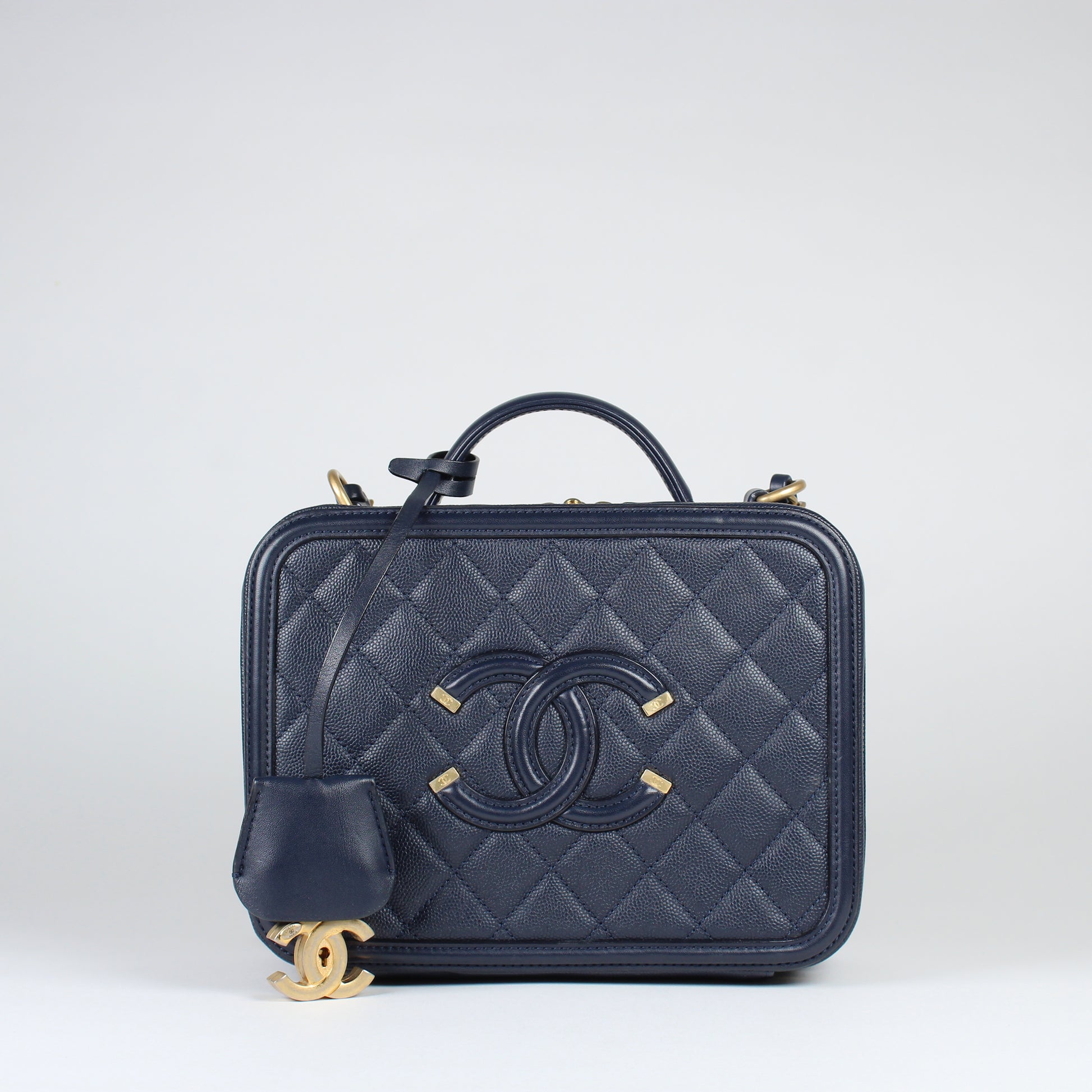Noteworthy Features: Structured vanity case design with top handle, interlocking CC logo, double zip closure, key and clochette detail, CC lock and clochette detail, and long leather-threaded chain strap with leather shoulder pad. Features partially stickered interior hardware.
