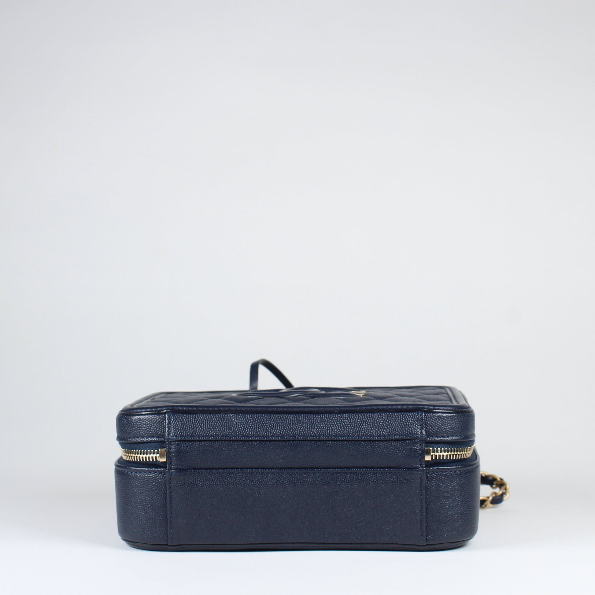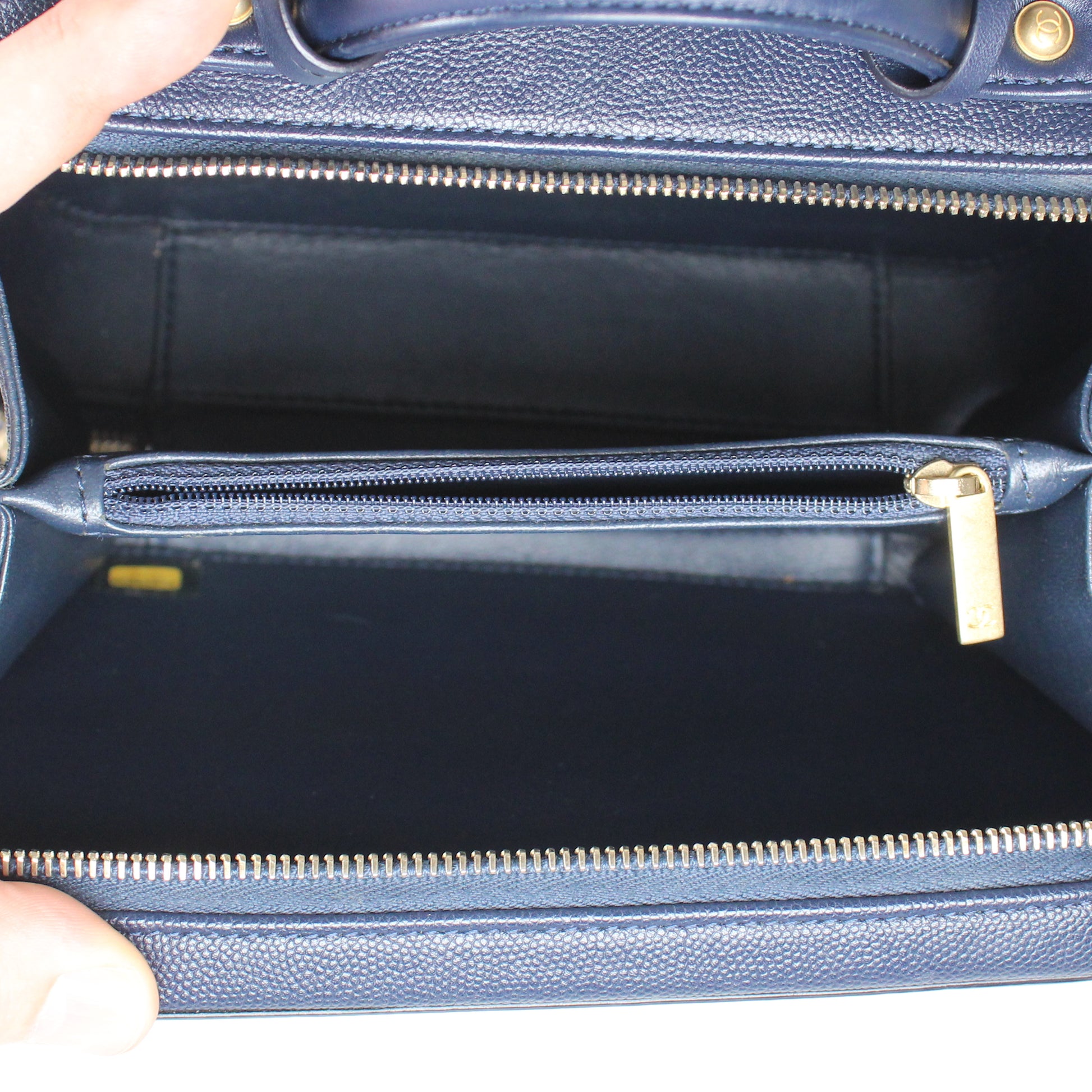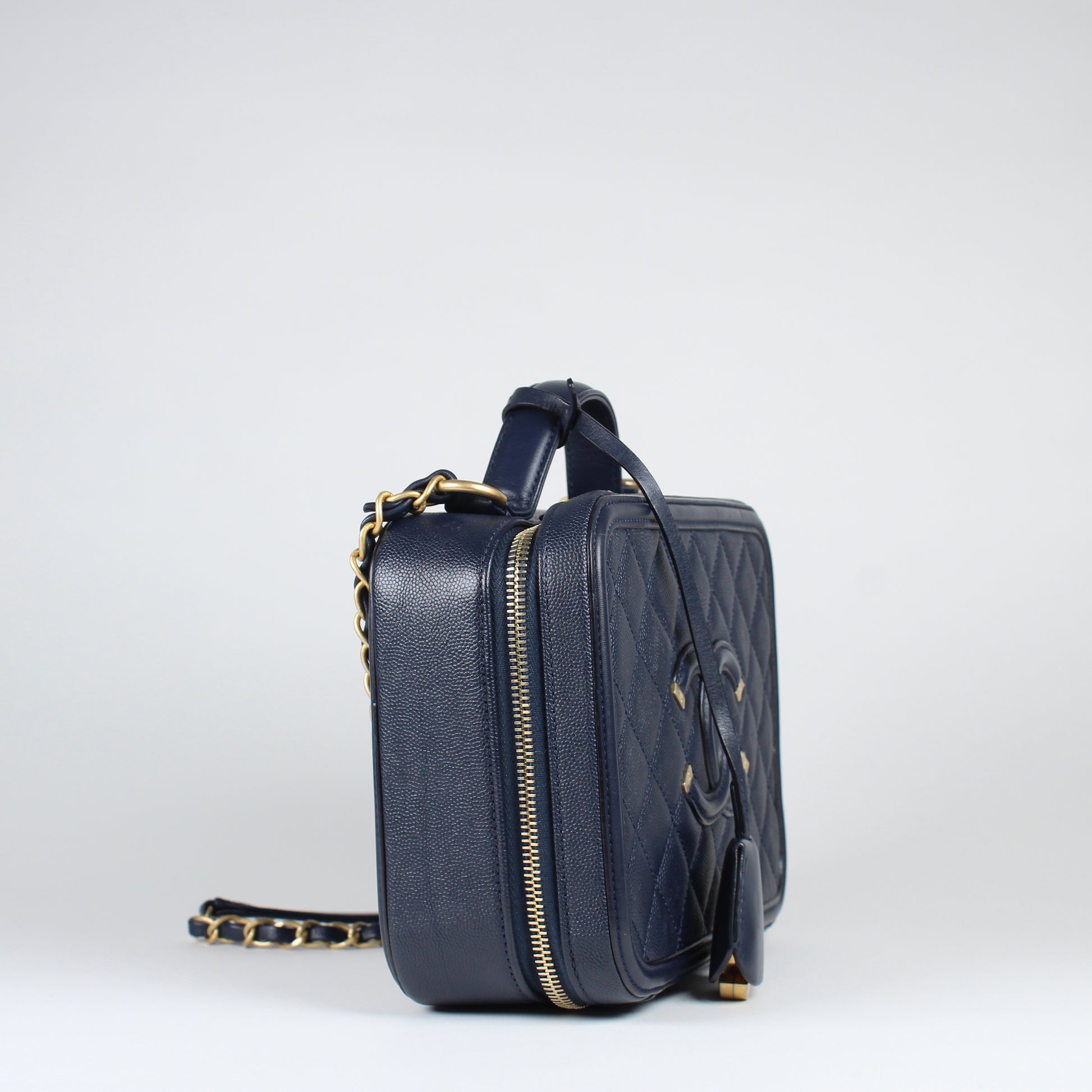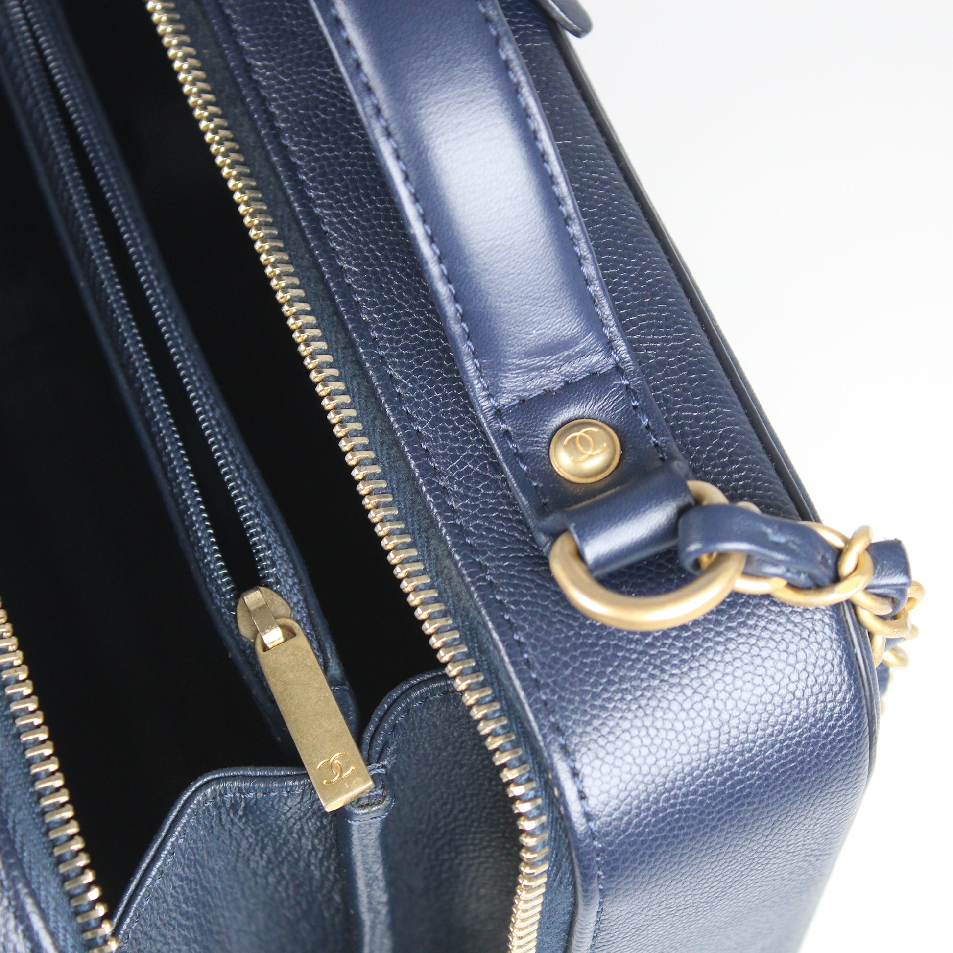 Noteworthy Features: Structured vanity case design with top handle, interlocking CC logo, double zip closure, key and clochette detail, CC lock and clochette detail, and long leather-threaded chain strap with leather shoulder pad. Features partially stickered interior hardware.