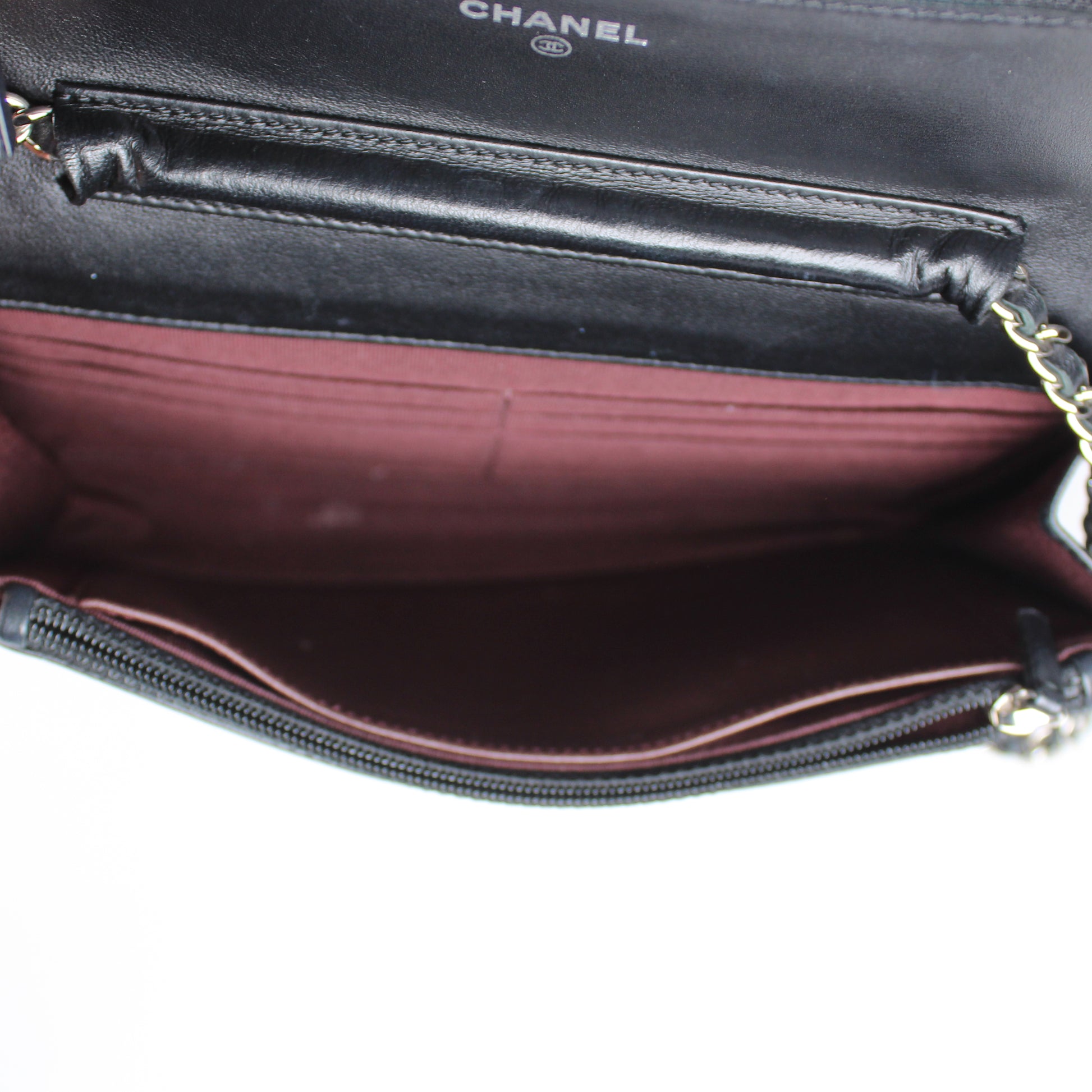 Noteworthy Features: Classic Chanel Wallet on Chain featuring diamond quilting, burgundy interior lining, and chain-leather strap