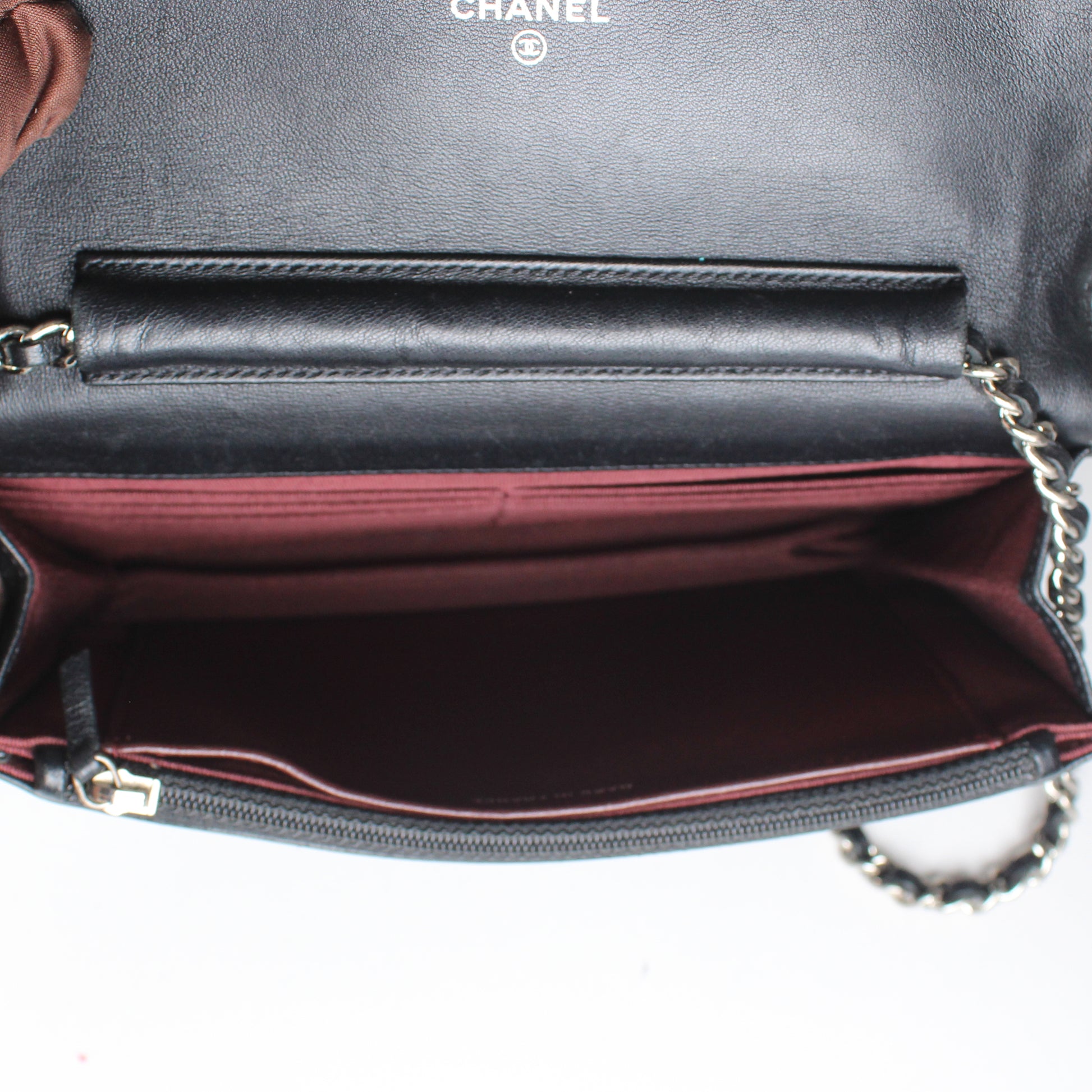 Noteworthy Features: Classic diamond quilting, CC logo snap closure, burgundy interior, and chain leather crossbody strap