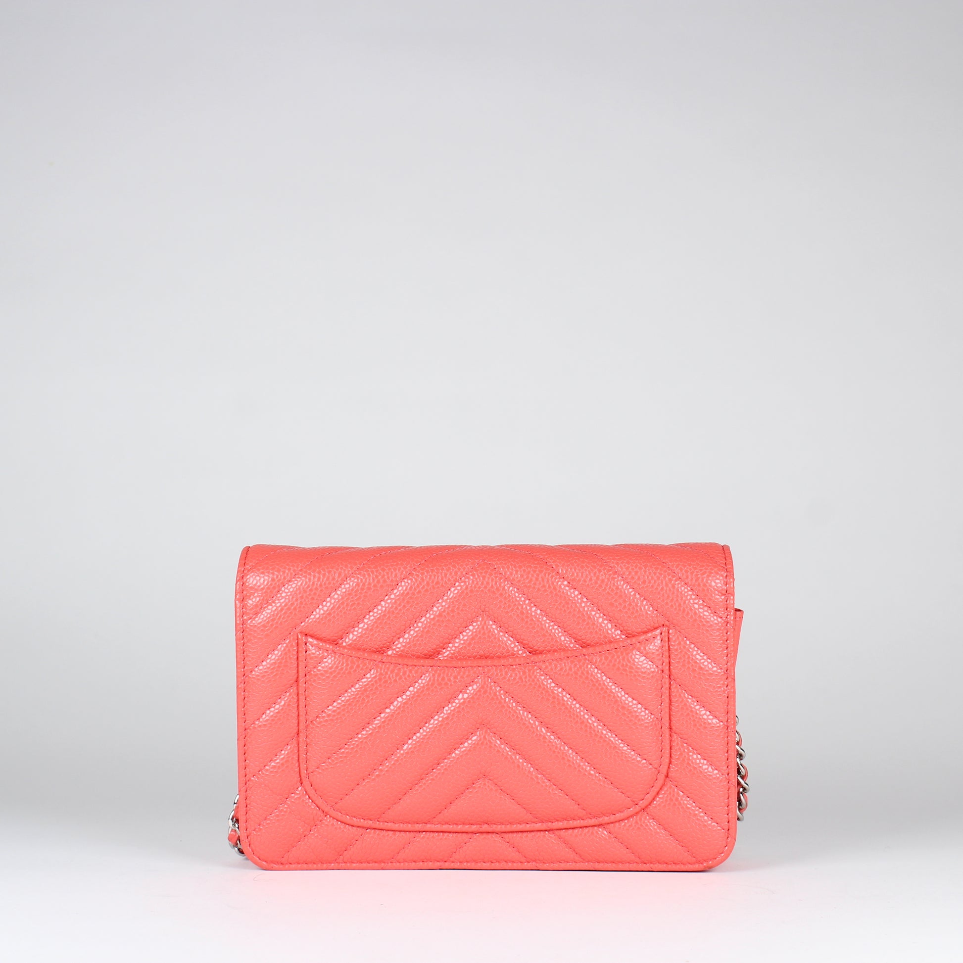 Noteworthy Features: Classic Wallet on Chain design featuring chevron quilting, flap closure with CC logo, and long leather-threaded chain strap